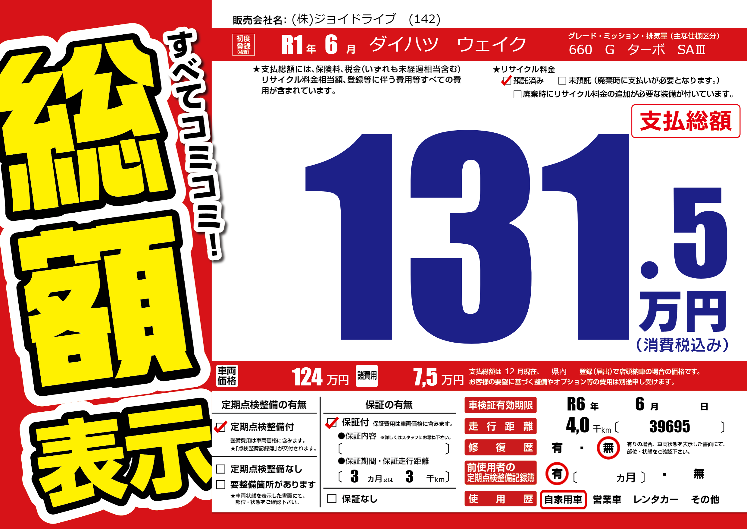 保証付き 保証内容(---) 3ヶ月または(3)千kmまで |