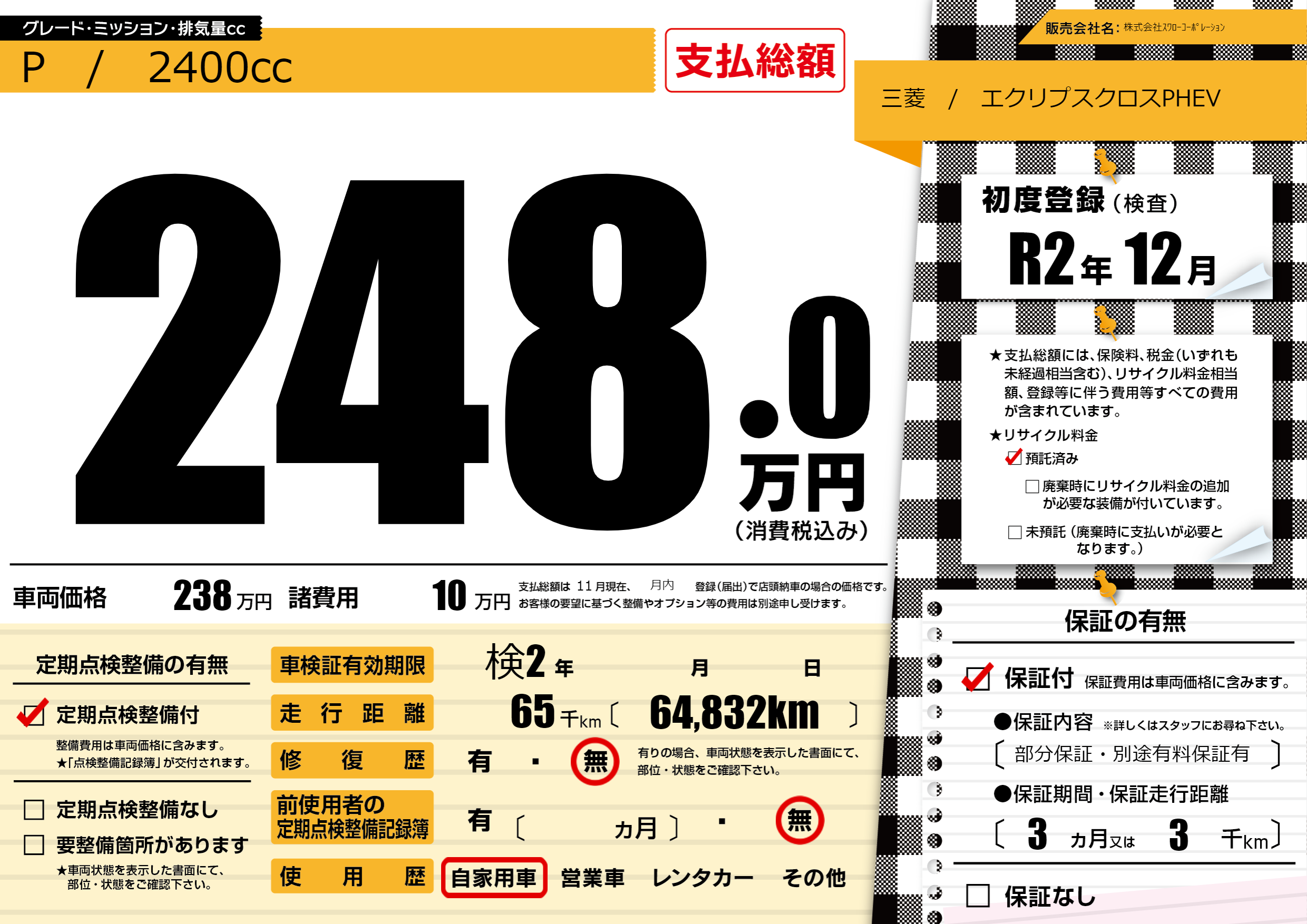 | 車名 | 三菱 / エクリプスクロスPHEV | グレード ミッション 排気量 |