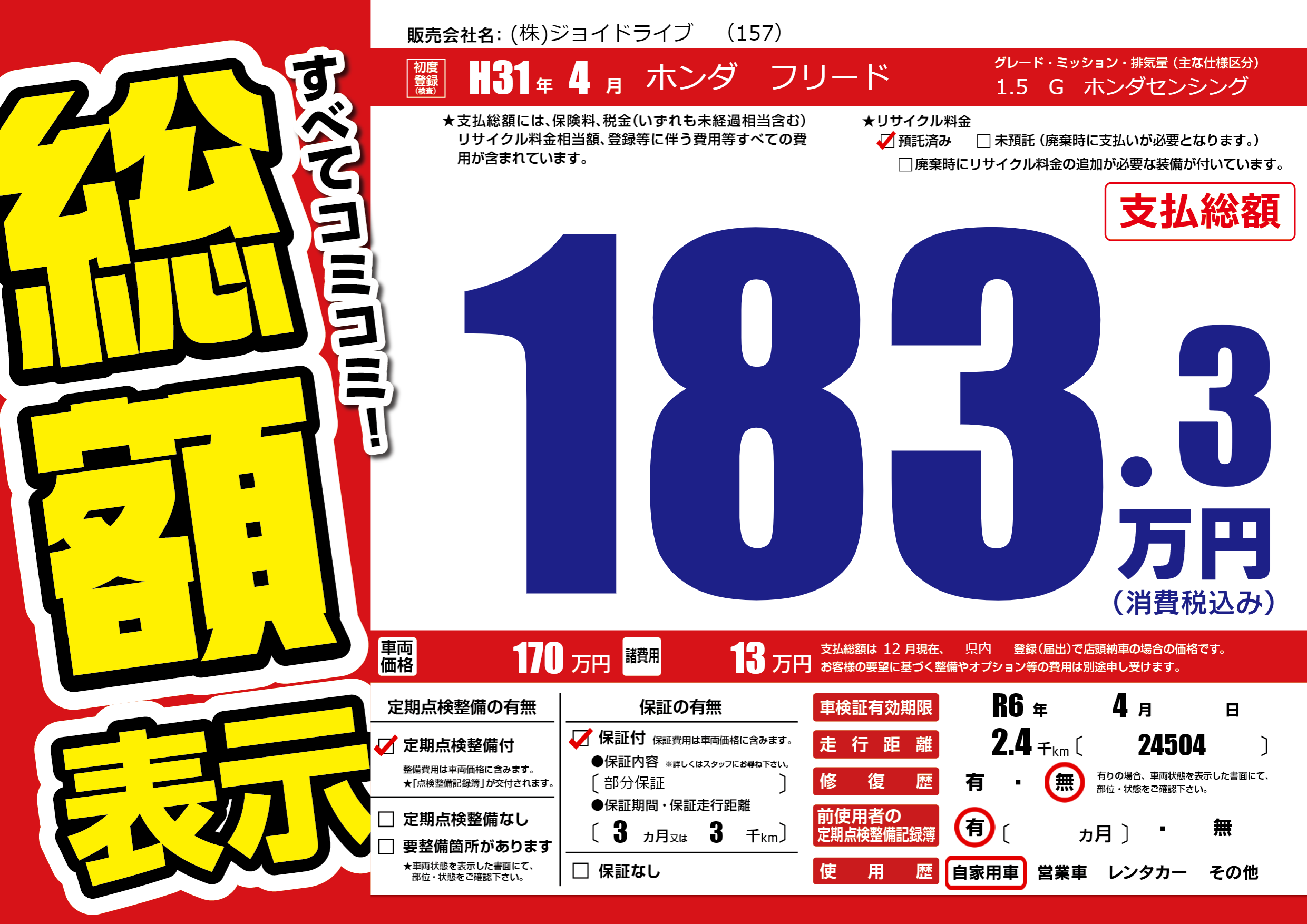 | 車名 | ホンダ フリード | グレード ミッション 排気量 |