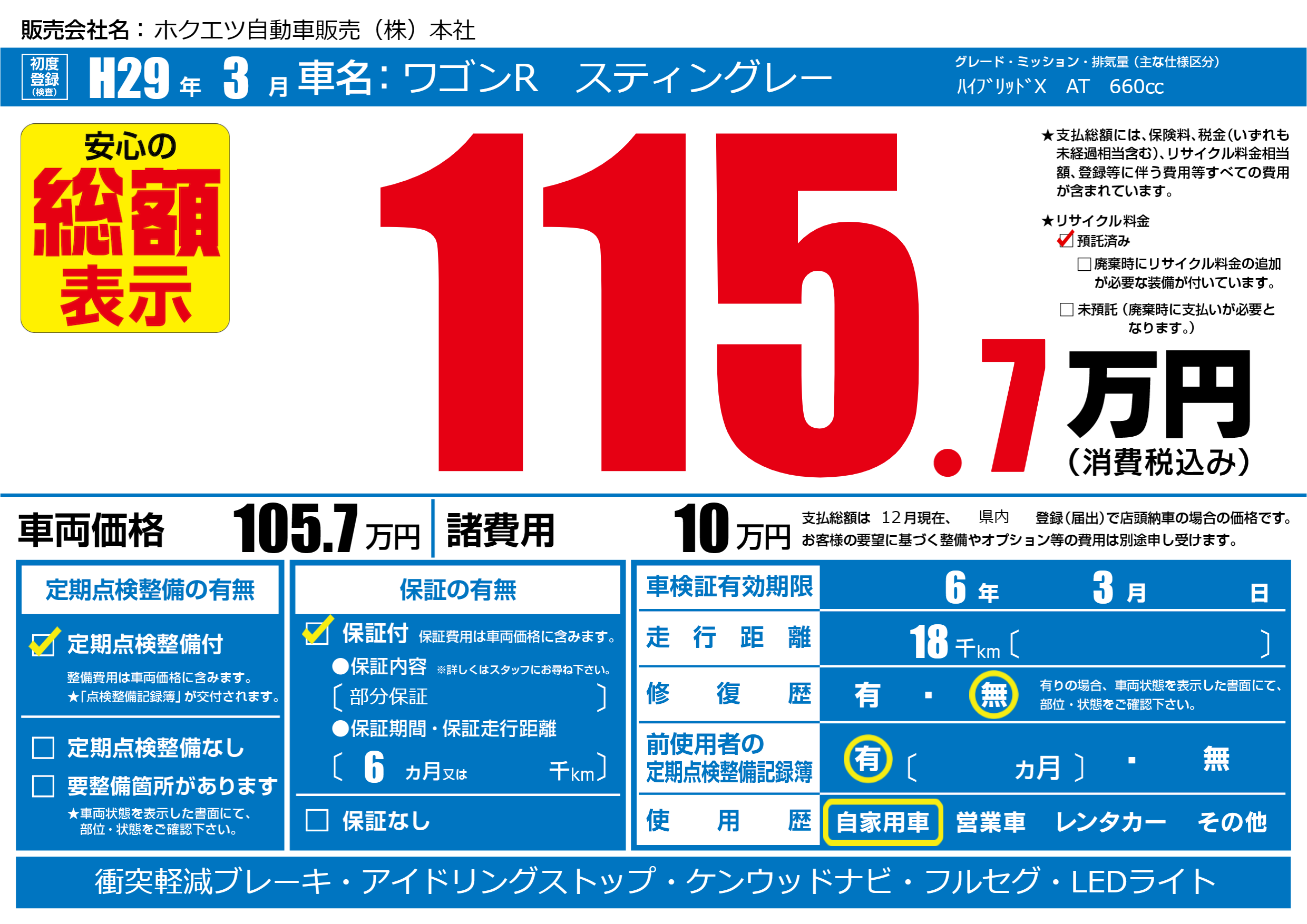 | 車名 | ワゴンR スティングレー | グレード ミッション 排気量 |