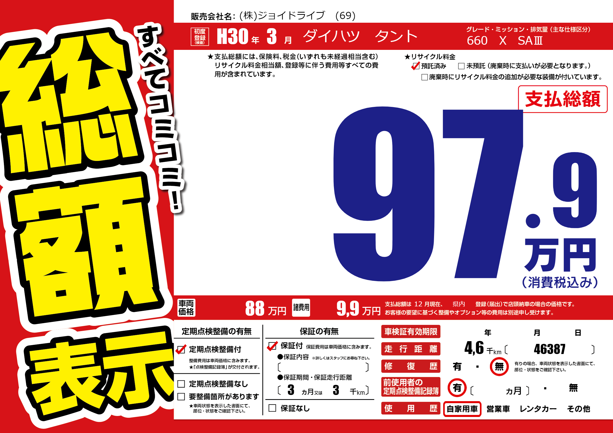 | 車名 | ダイハツ タント | グレード ミッション 排気量 |