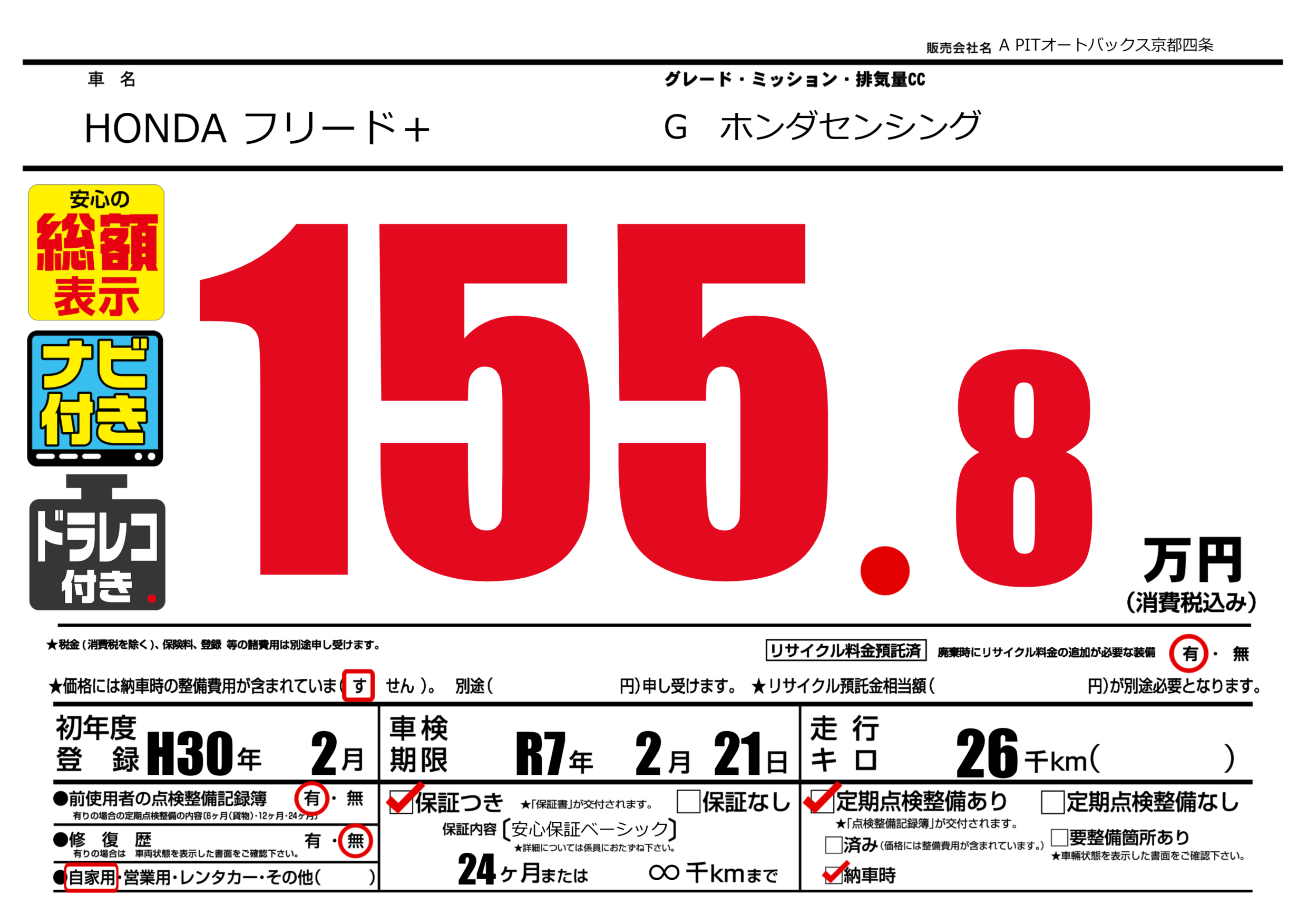 | 車名 | HONDA フリード+ | グレード ミッション 排気量 |