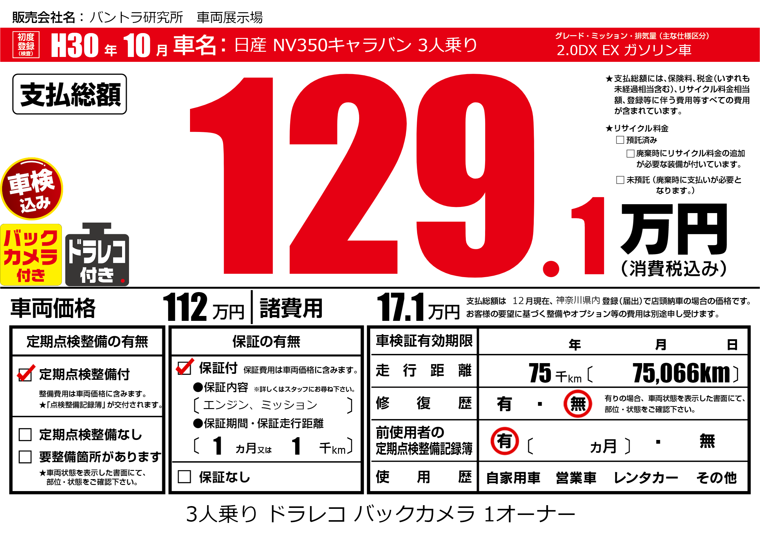 | 車名 | 日産 NV350キャラバン 3人乗り | グレード ミッション 排気量 |