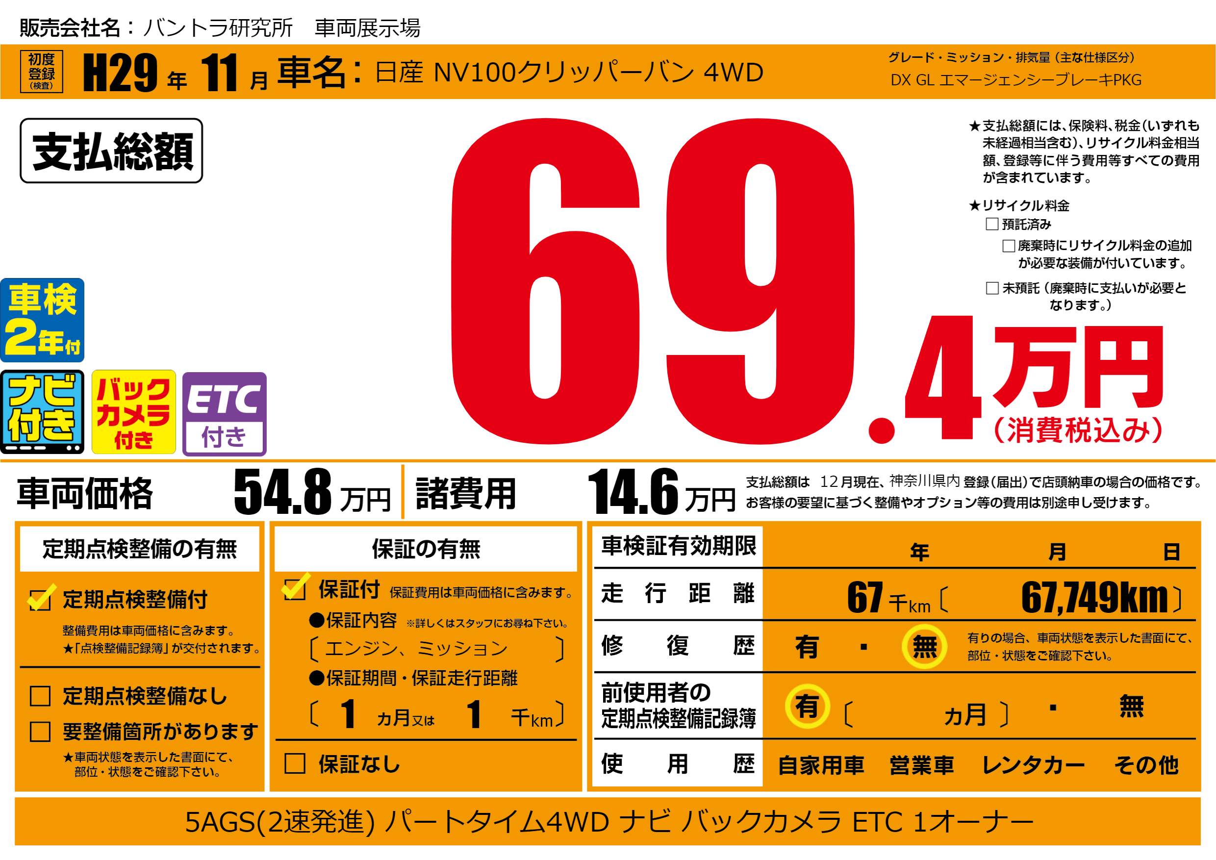 | 車名 | 日産 NV100クリッパーバン 4WD | グレード ミッション 排気量 |