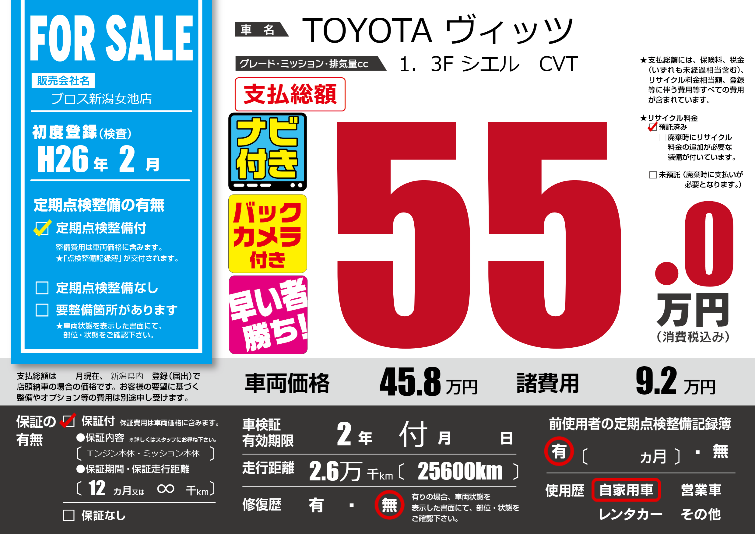 | 車名 | TOYOTA ヴィッツ | グレード ミッション 排気量 |