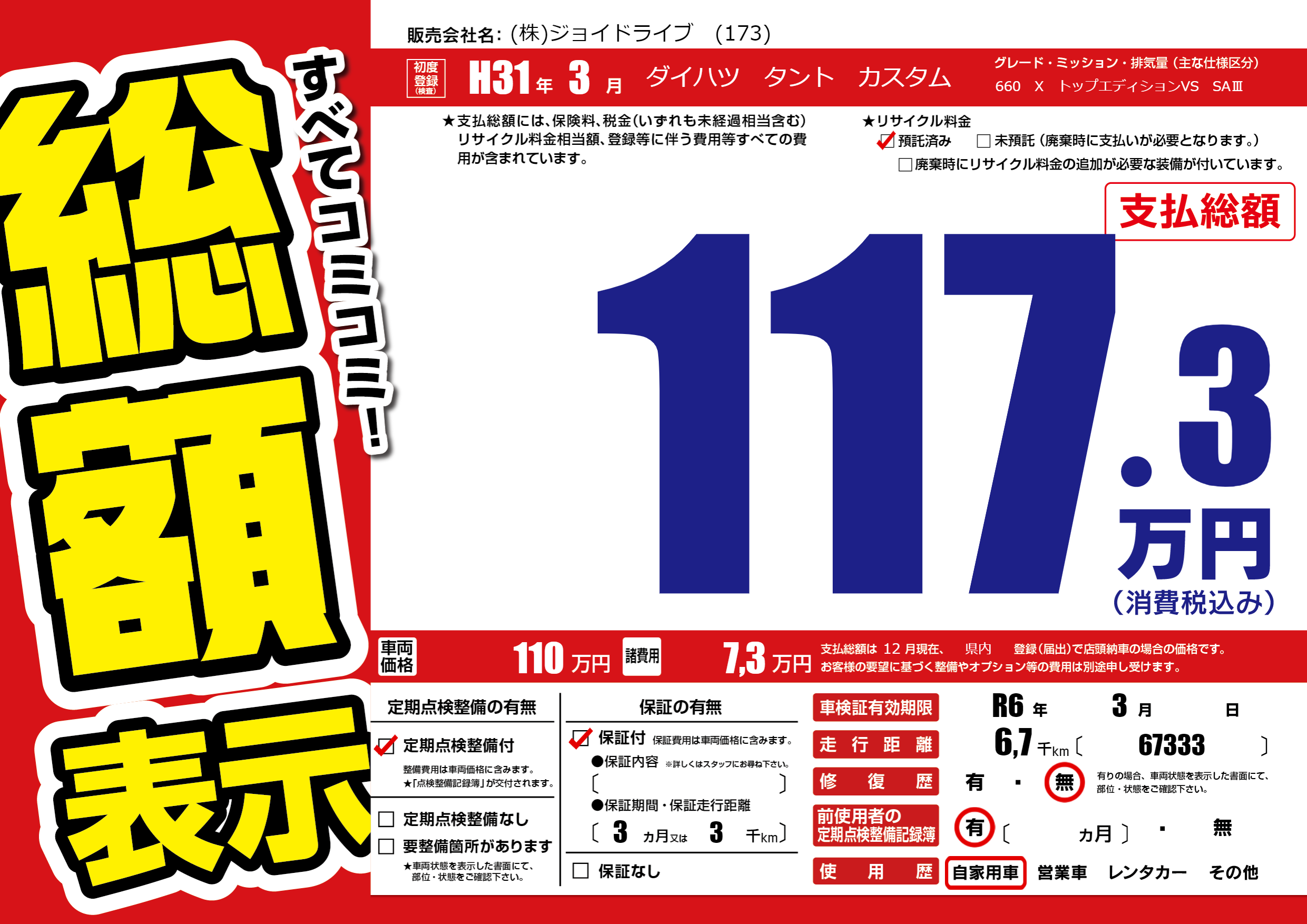 保証付き 保証内容(---) 3ヶ月または(3)千kmまで |