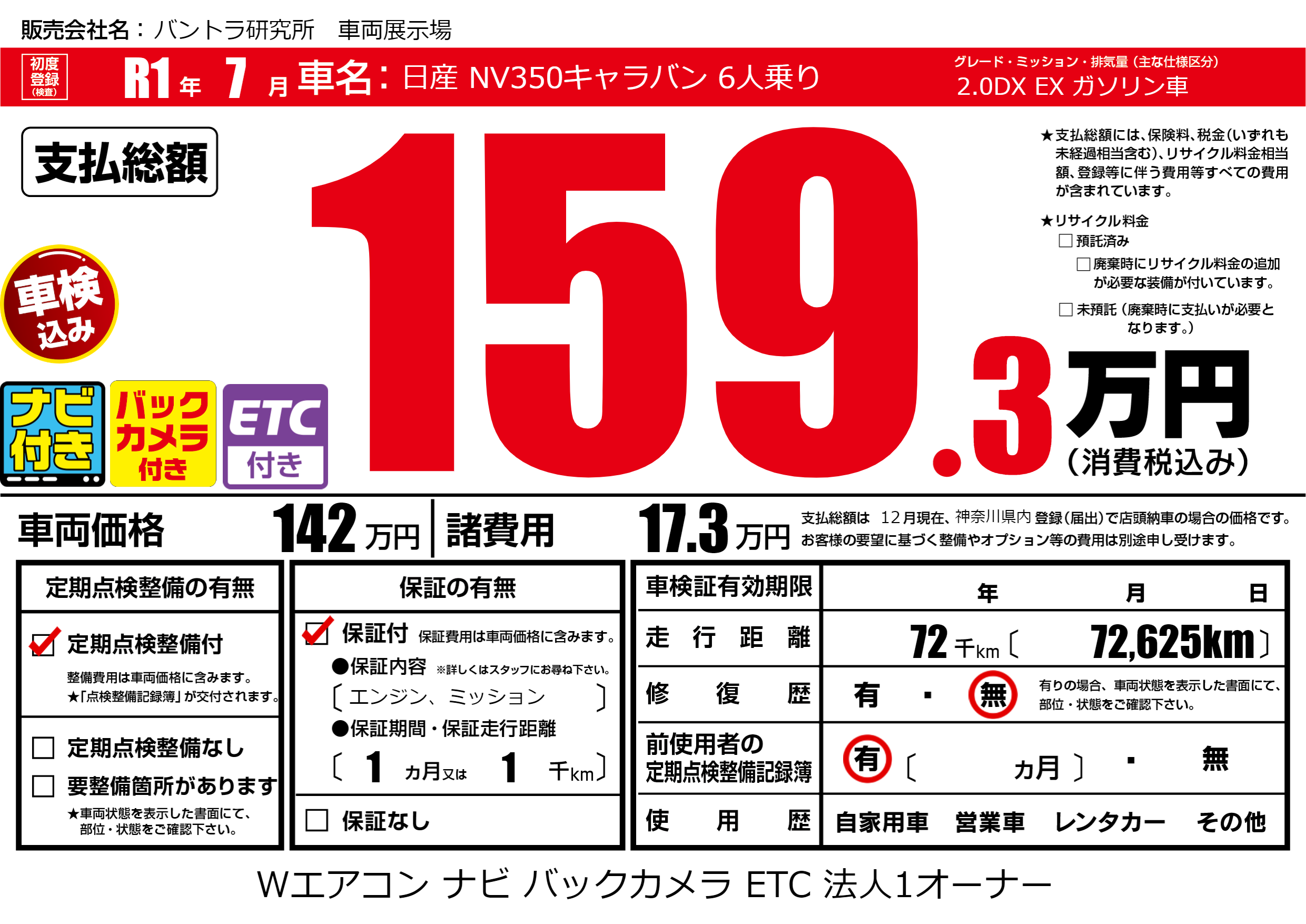 | 車名 | 日産 NV350キャラバン 6人乗り | グレード ミッション 排気量 |