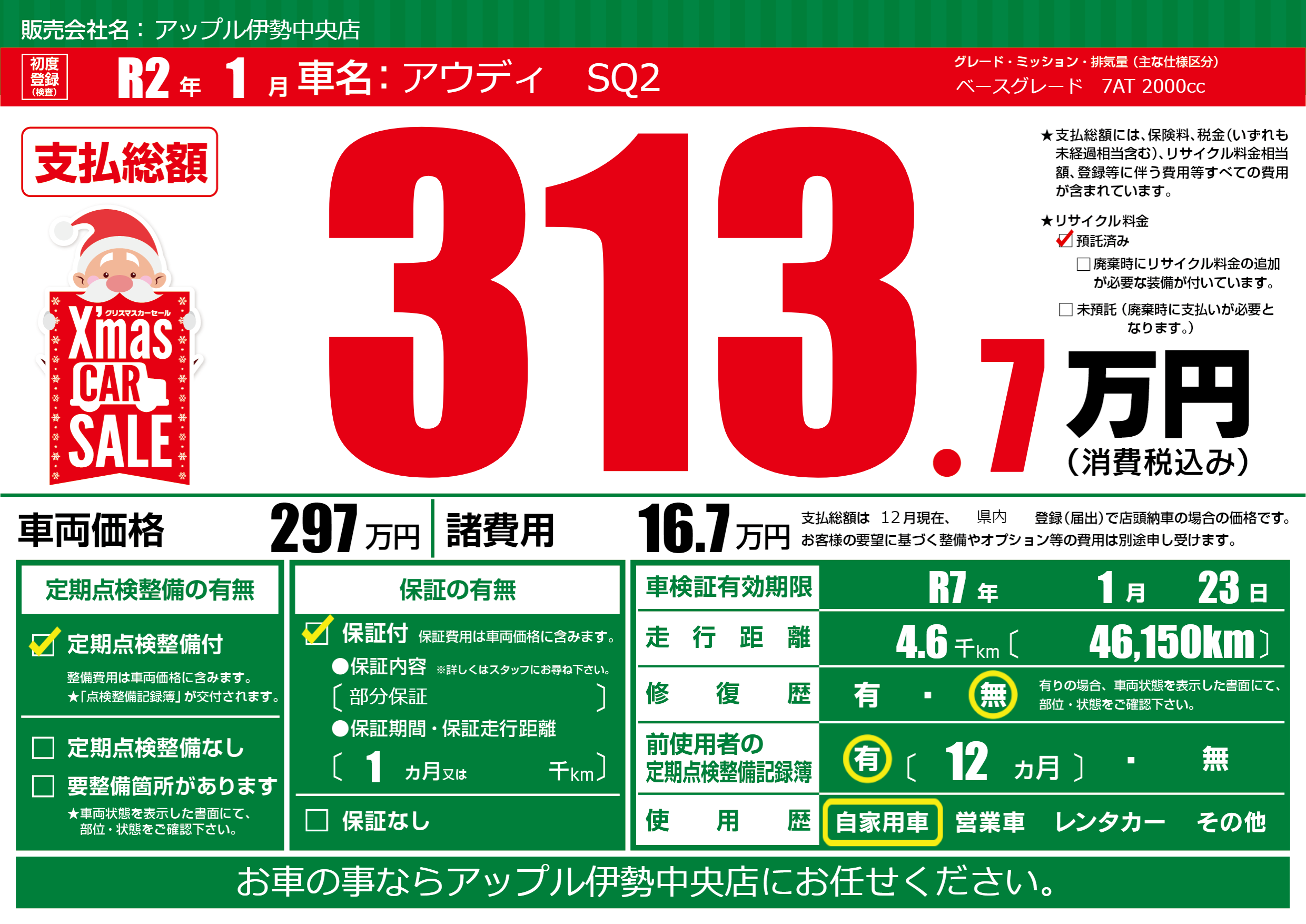 | 車名 | アウディ SQ2 | グレード ミッション 排気量 |