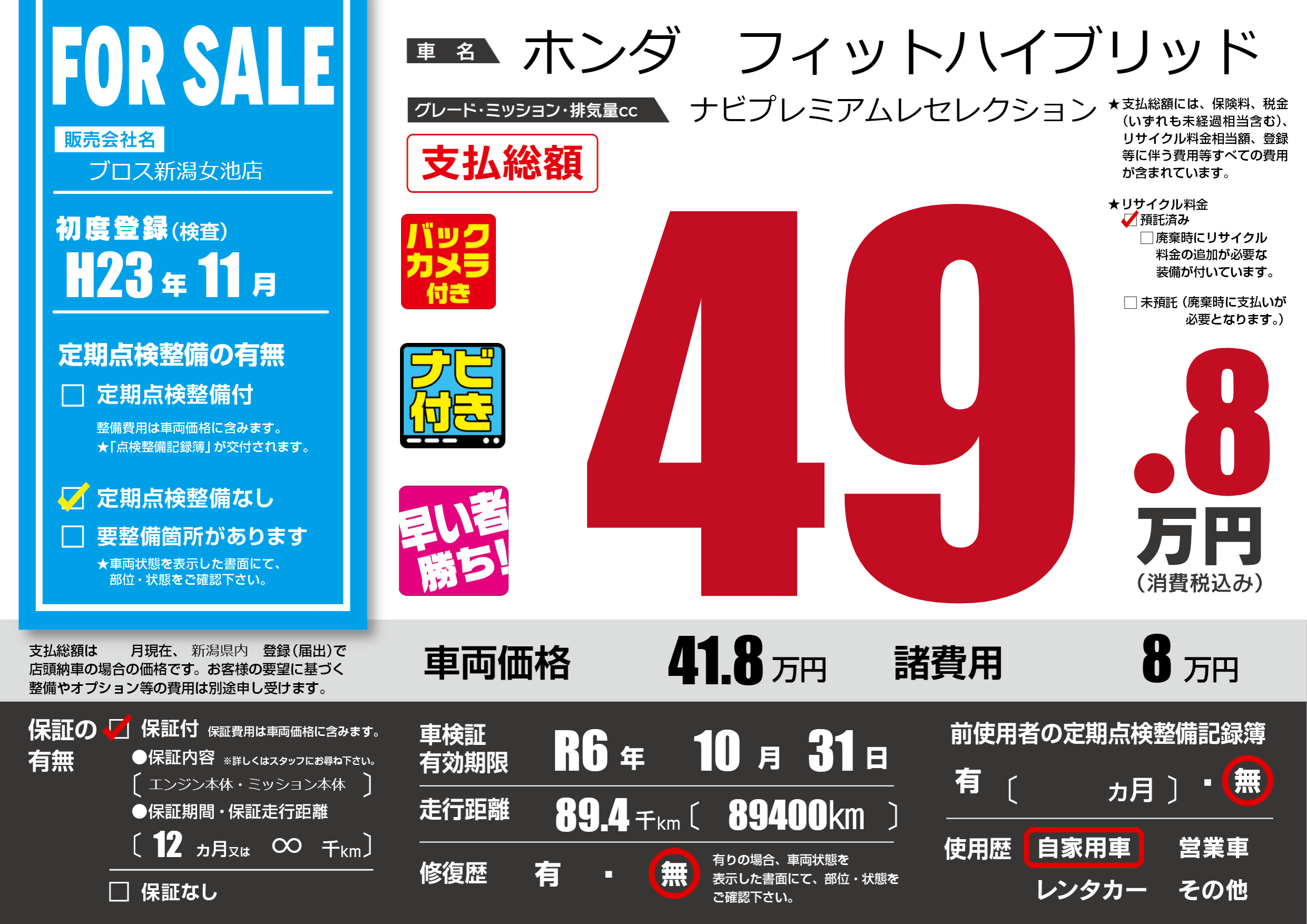 | 走行キロ | 8.9万km | 初年度登録 | H23年11月 |