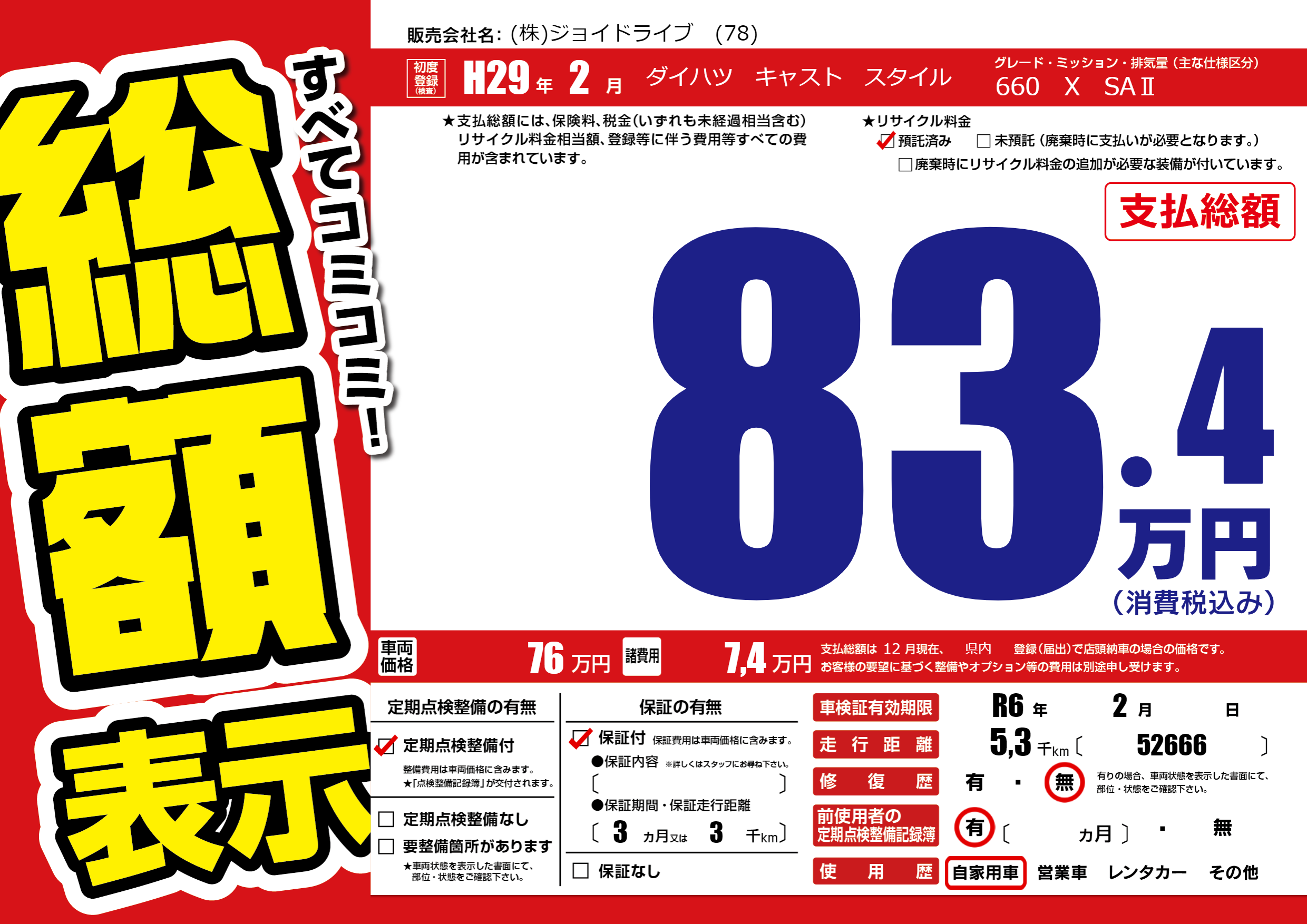 | 車名 | ダイハツ キャスト スタイル | グレード ミッション 排気量 |