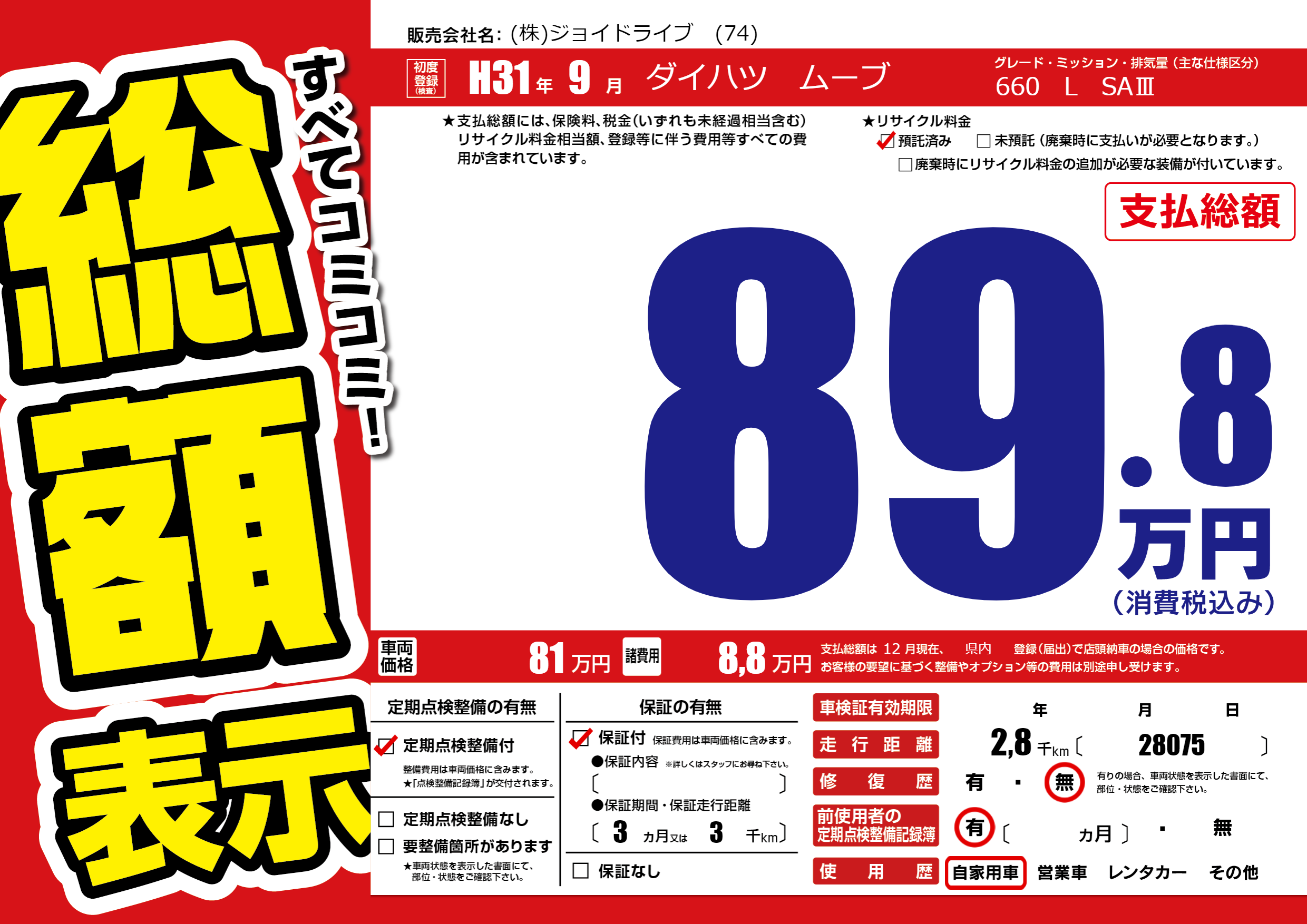 保証付き 保証内容(---) 3ヶ月または(3)千kmまで |