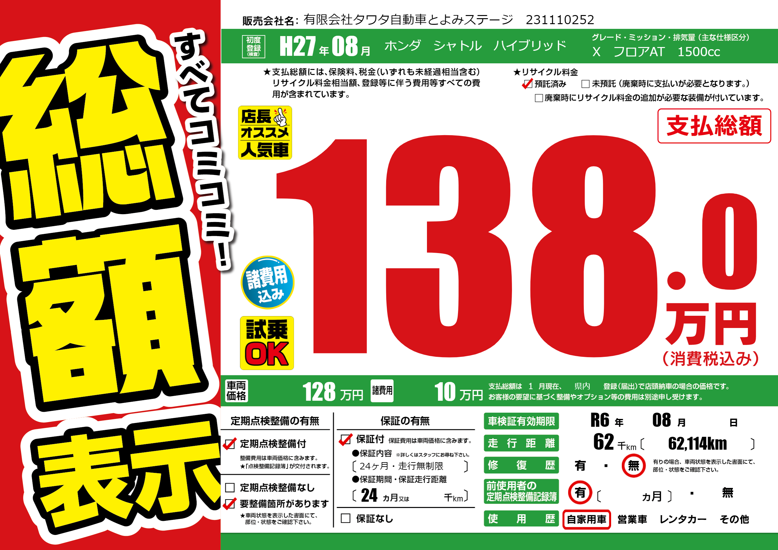 | 車名 | ホンダ シャトル ハイブリッド | グレード ミッション 排気量 |