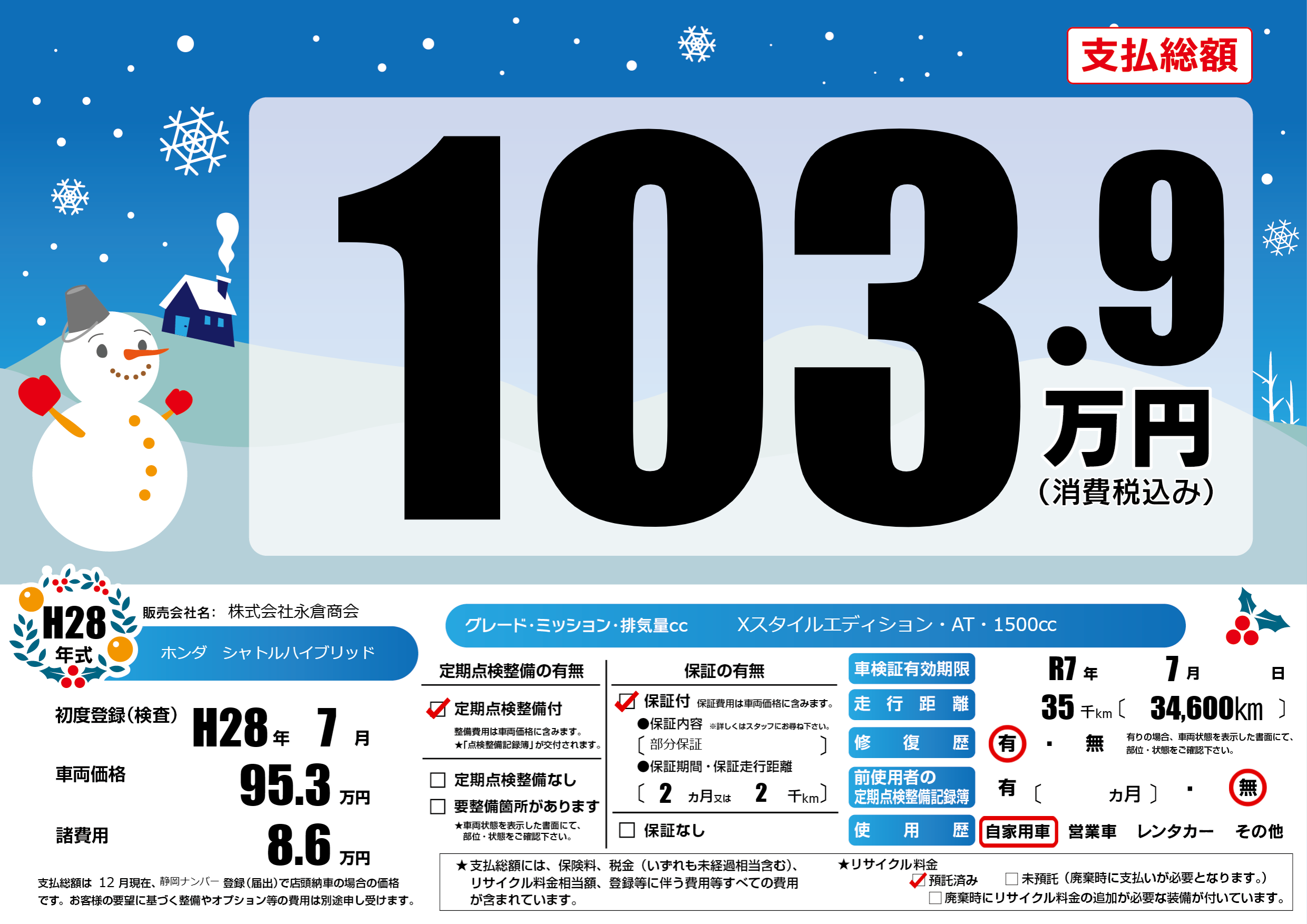 | 車名 | ホンダ シャトルハイブリッド | グレード ミッション 排気量 |