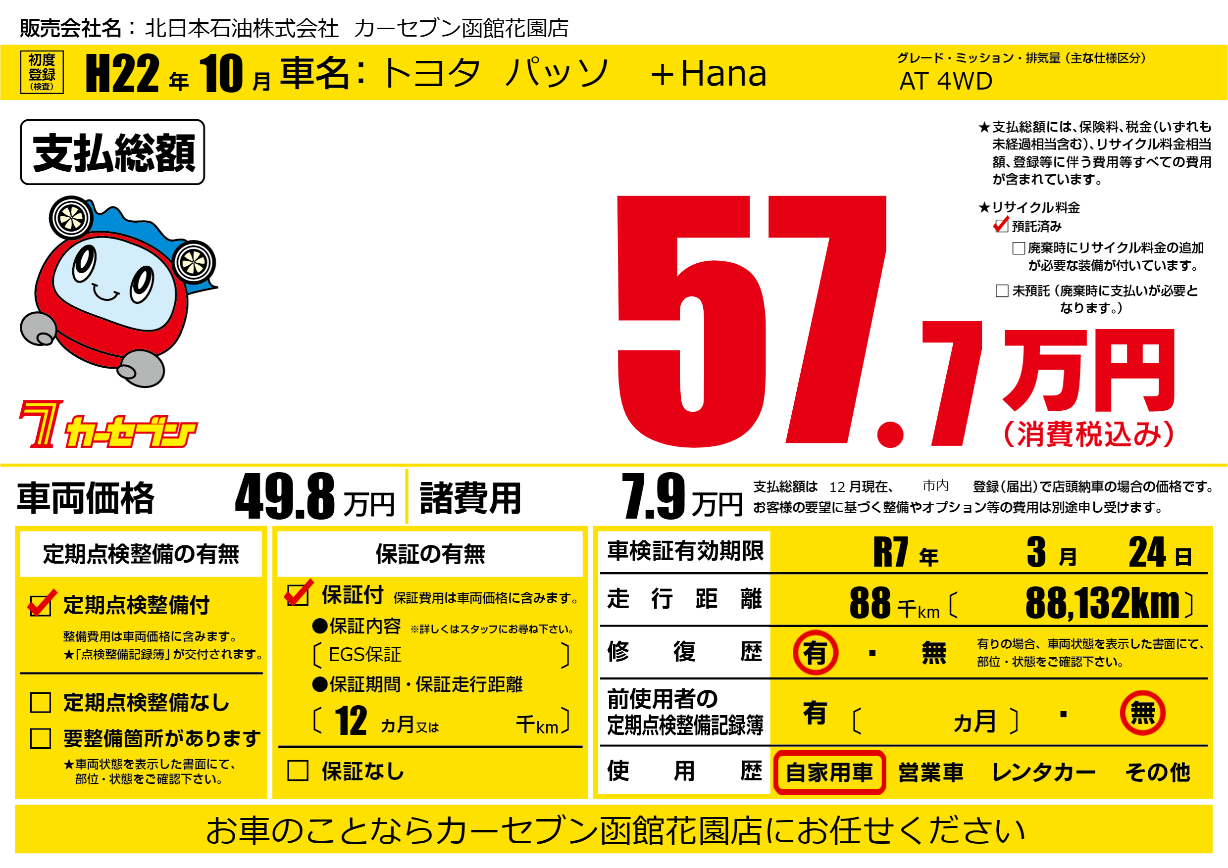| 車名 | トヨタ パッソ +Hana | グレード ミッション 排気量 |