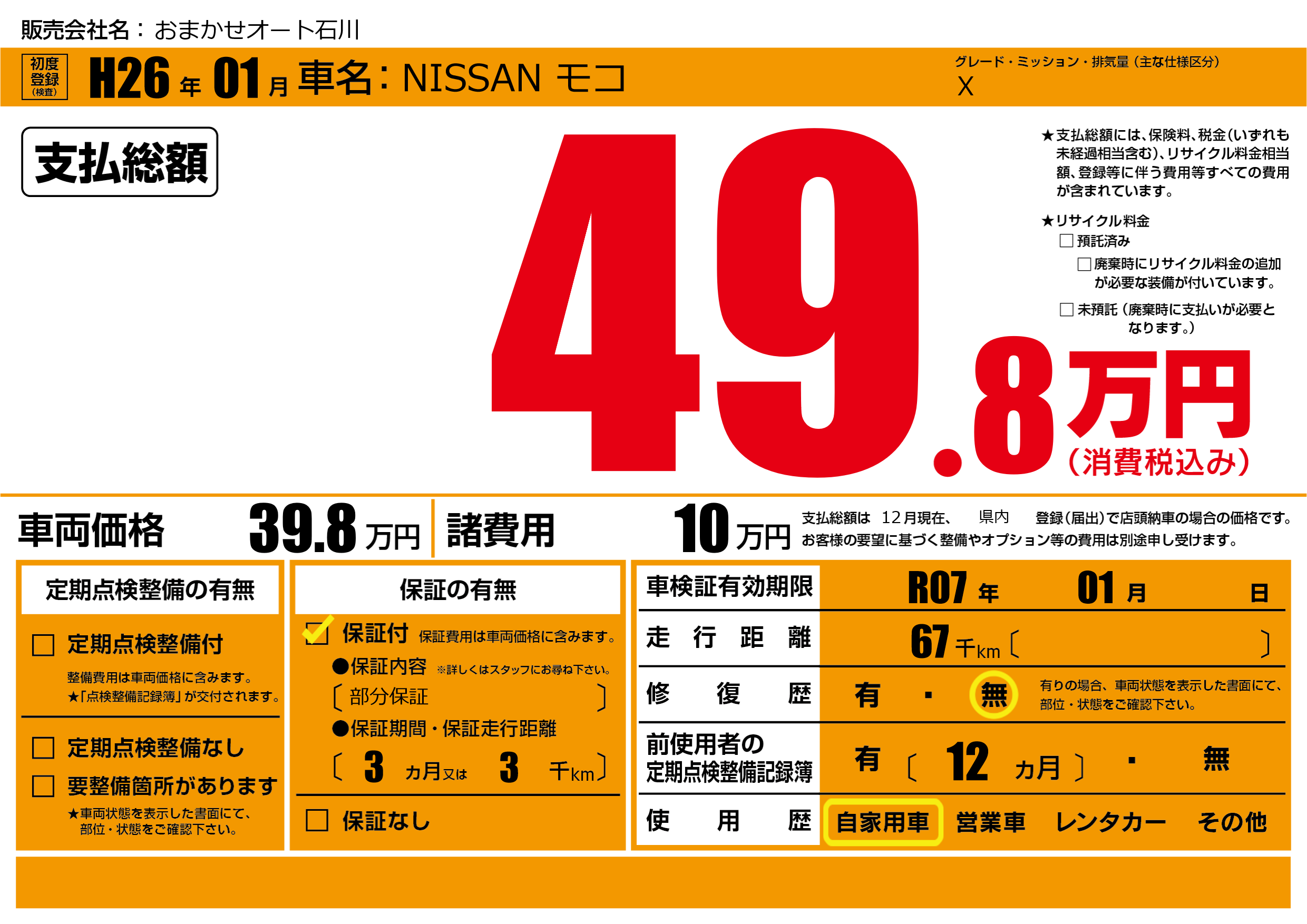 | 車名 | NISSAN モコ | グレード ミッション 排気量 |