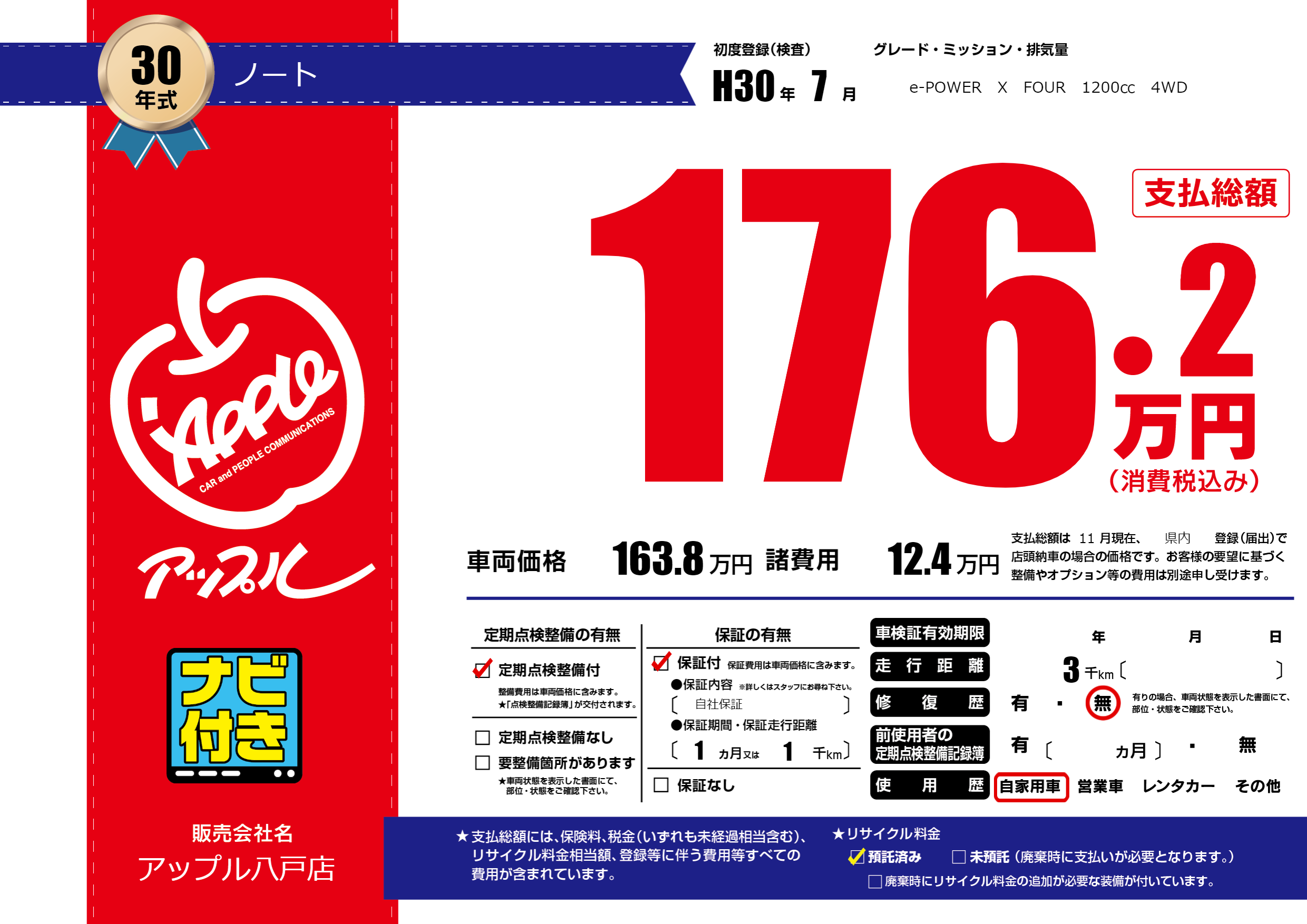| 走行キロ | 0.3万km | 初年度登録 | H30年7月 |