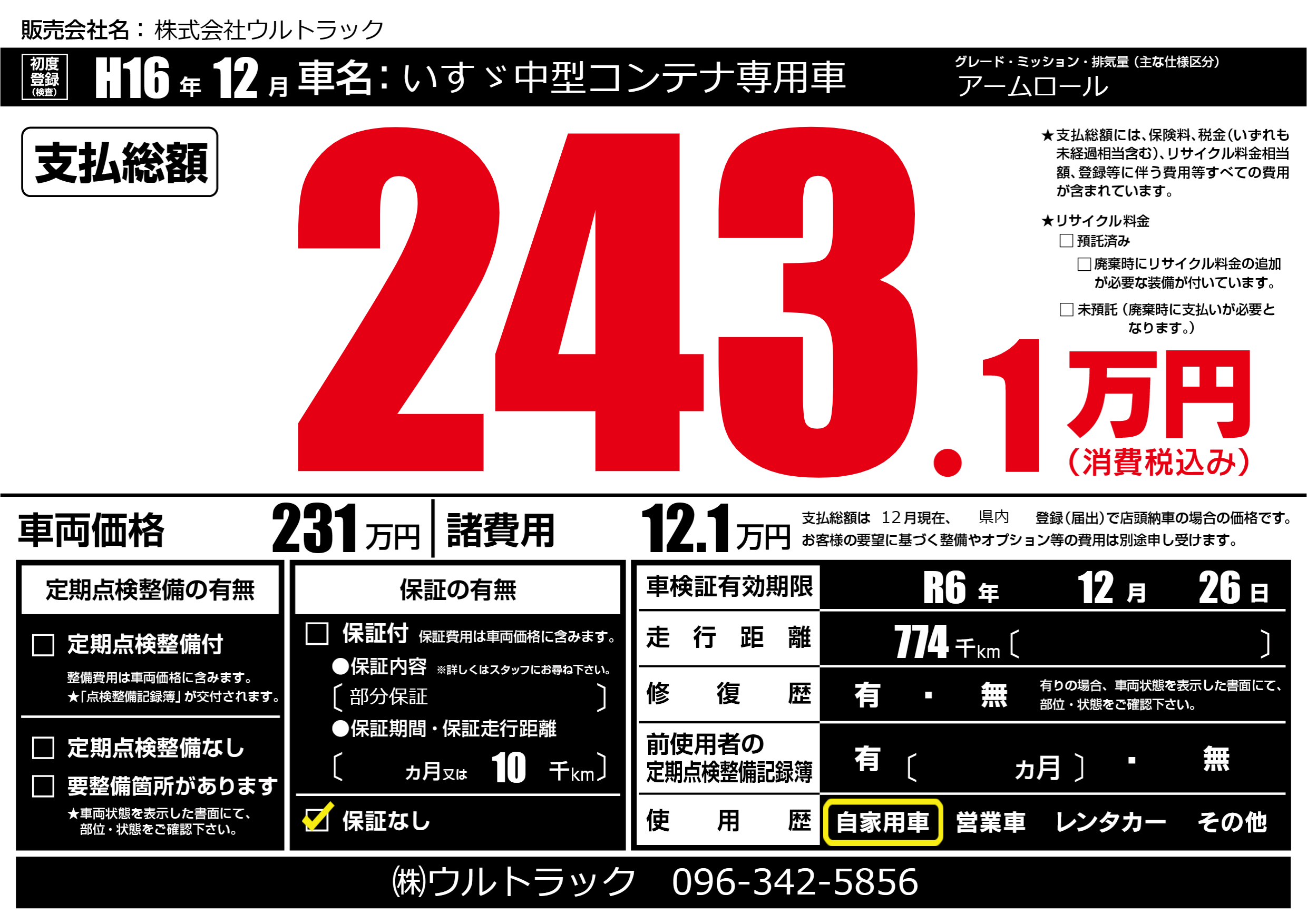 | 走行キロ | 77.4万km | 初年度登録 | H16年12月 |