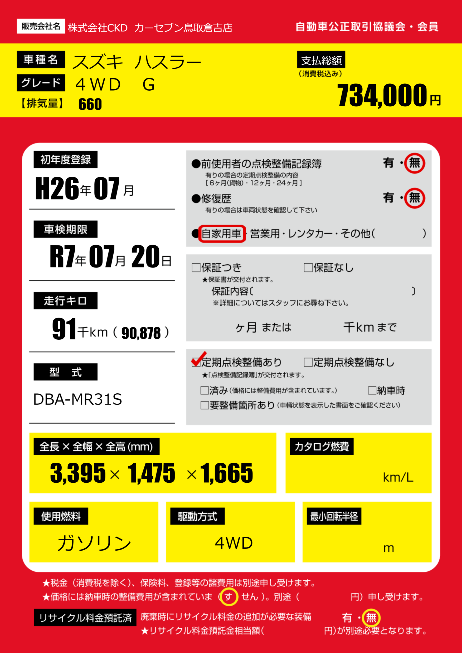 | 走行キロ | 9.1万km | 初年度登録 | H26年07月 |