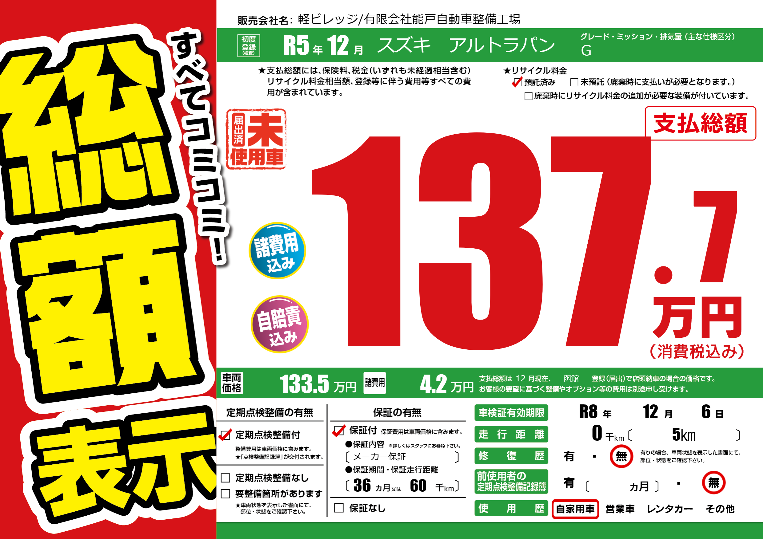 | 走行キロ | - | 初年度登録 | R5年12月 |