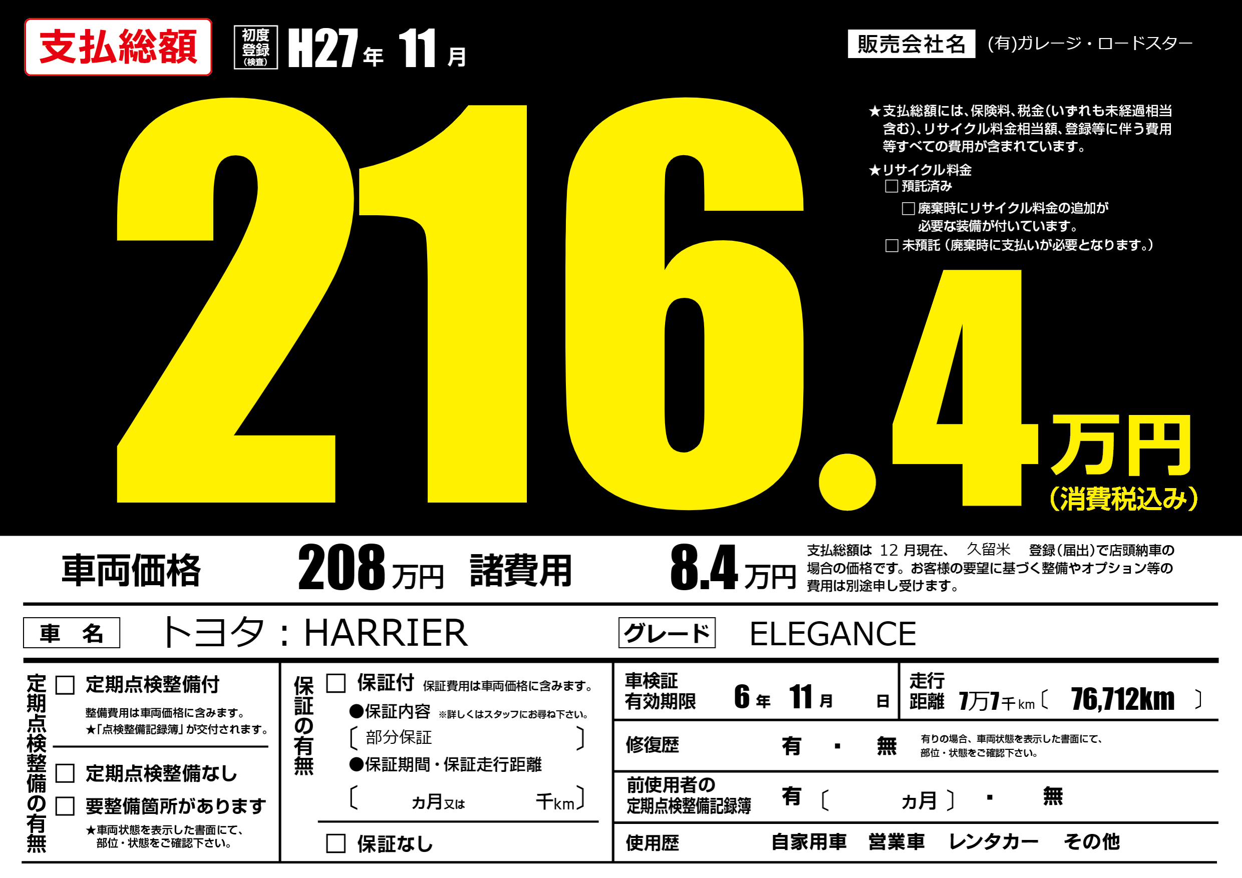保証なし 保証内容(部分保証) ---ヶ月または()千kmまで |