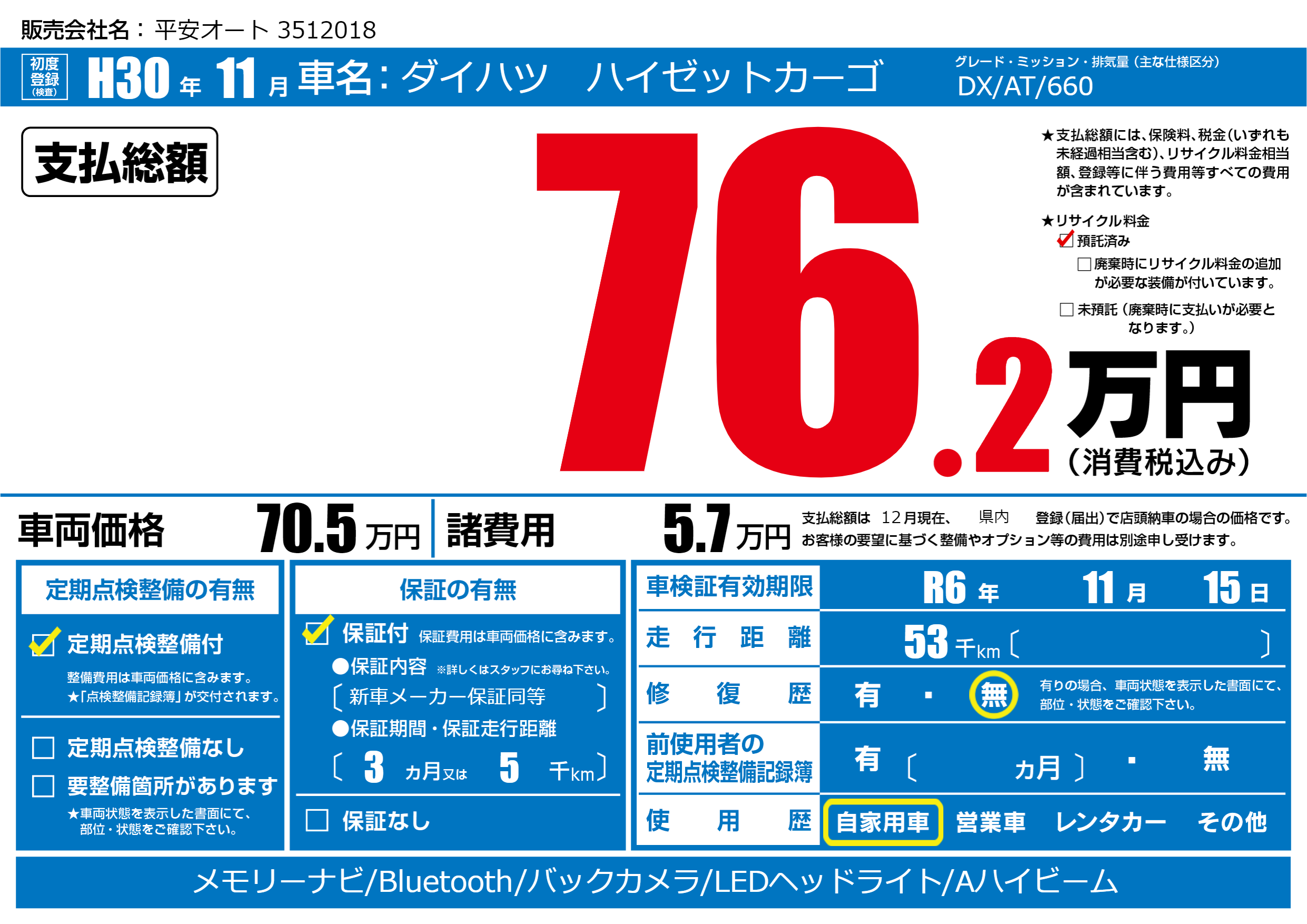 | 車検制限 | R6年 11月 15日 | ||