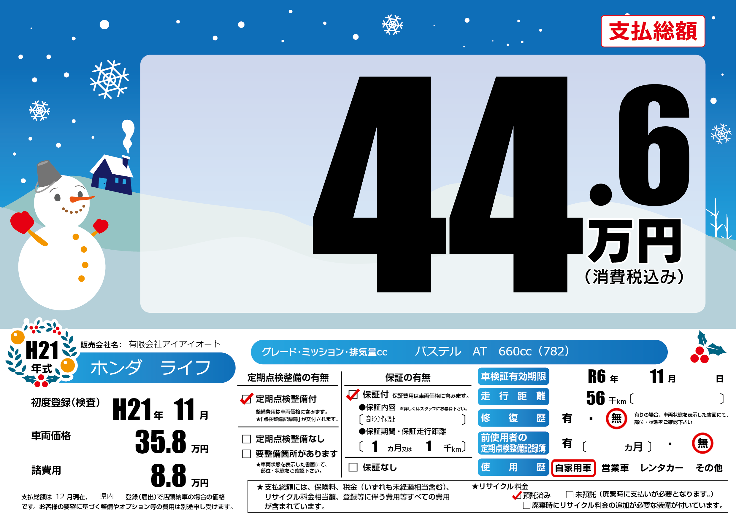 | 車名 | ホンダ ライフ | グレード ミッション 排気量 |