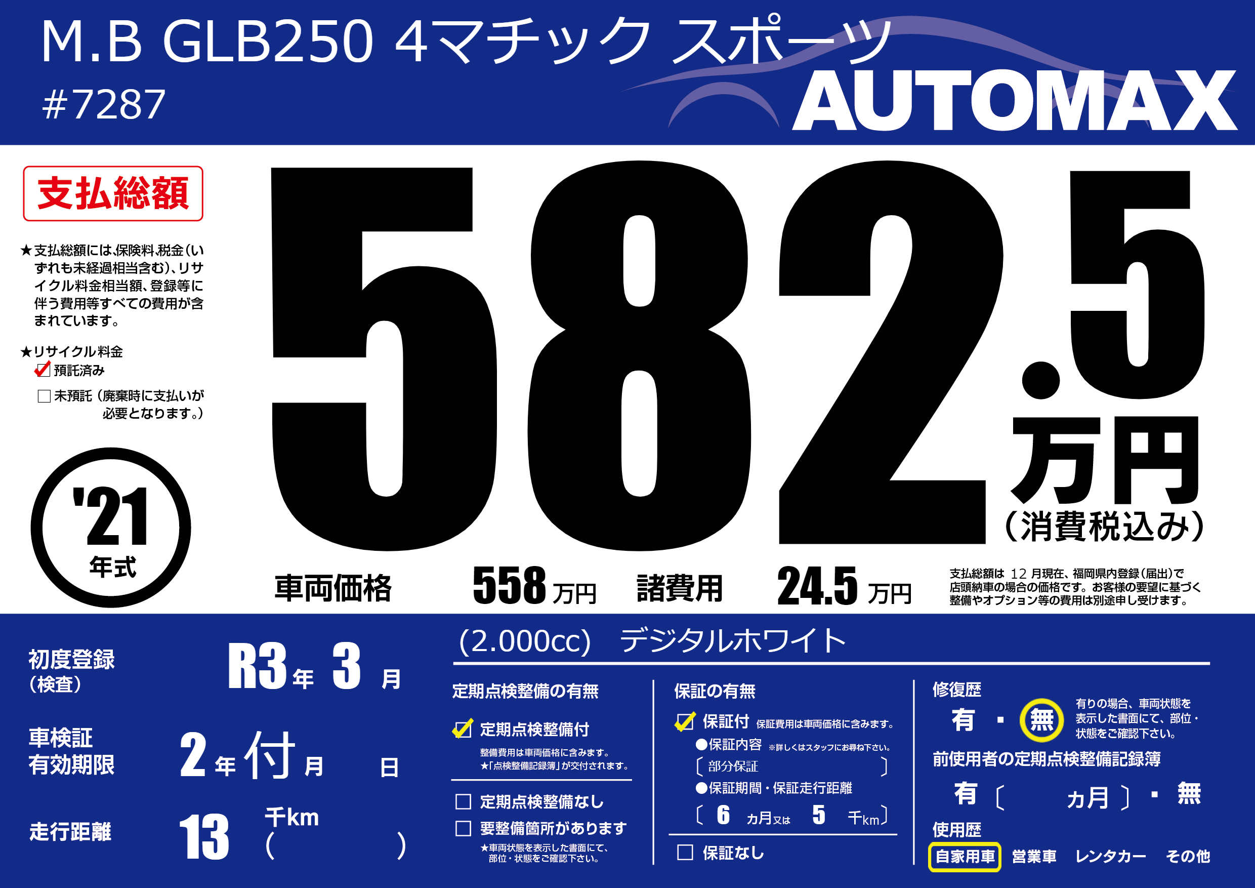 | 車名 | M.B GLB250 4マチック スポーツ | グレード ミッション 排気量 |