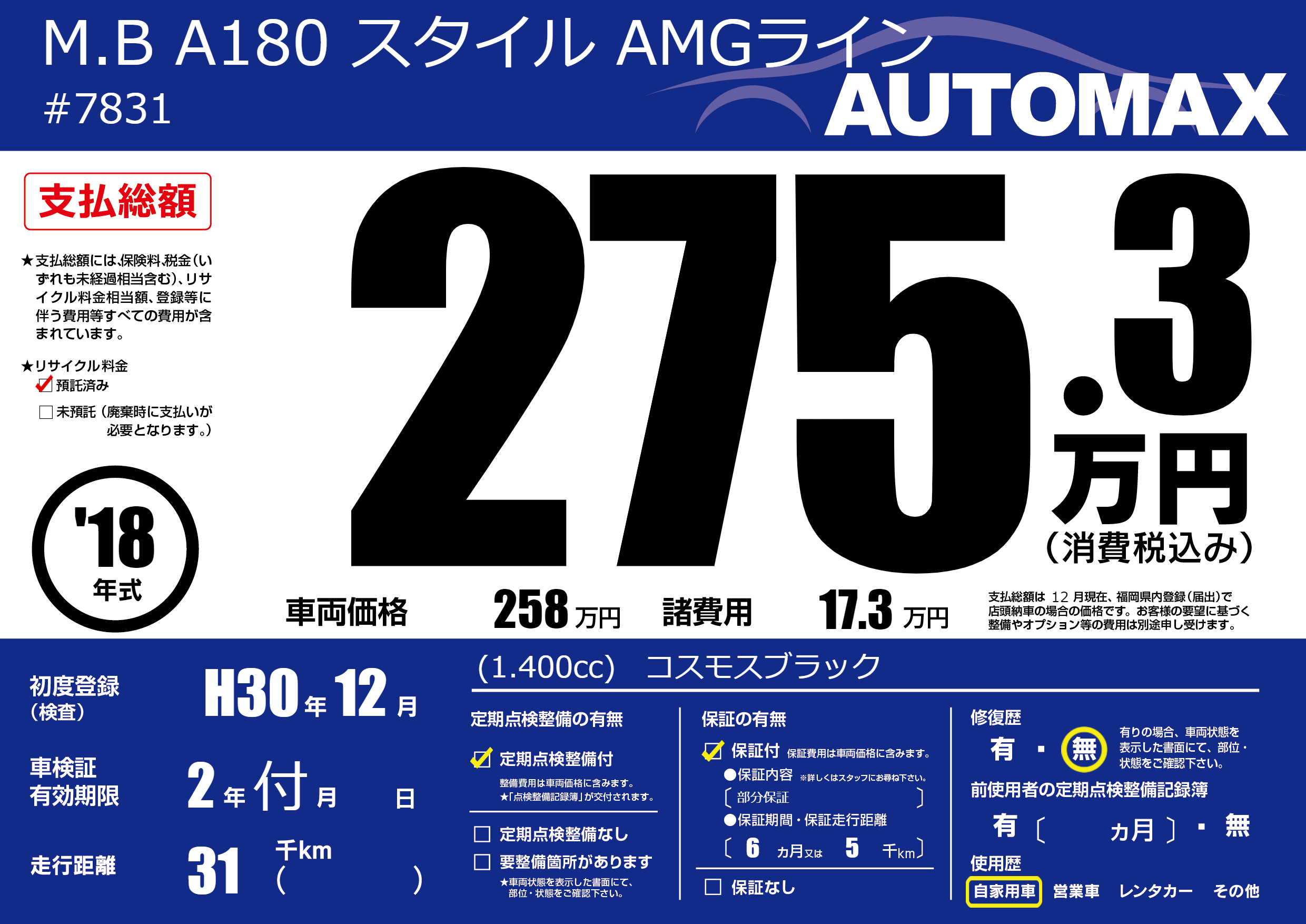| 車名 | M.B A180 スタイル AMGライン | グレード ミッション 排気量 |