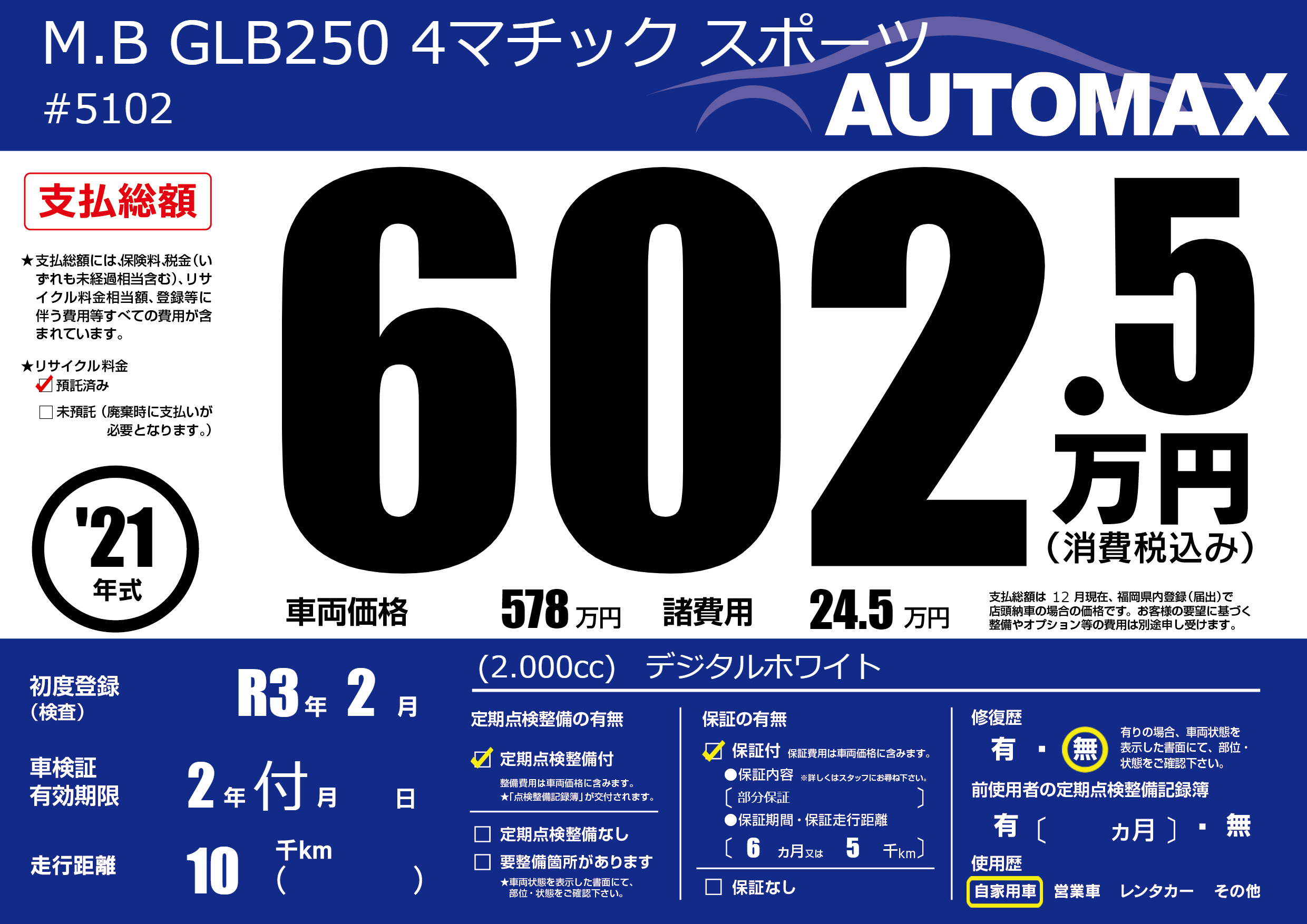 | 車名 | M.B GLB250 4マチック スポーツ | グレード ミッション 排気量 |
