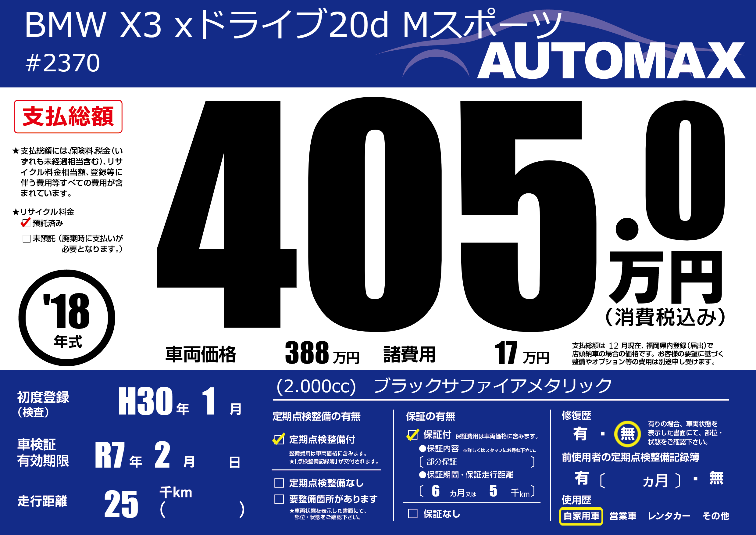 | 車名 | BMW X3 xドライブ20d Mスポーツ | グレード ミッション 排気量 |