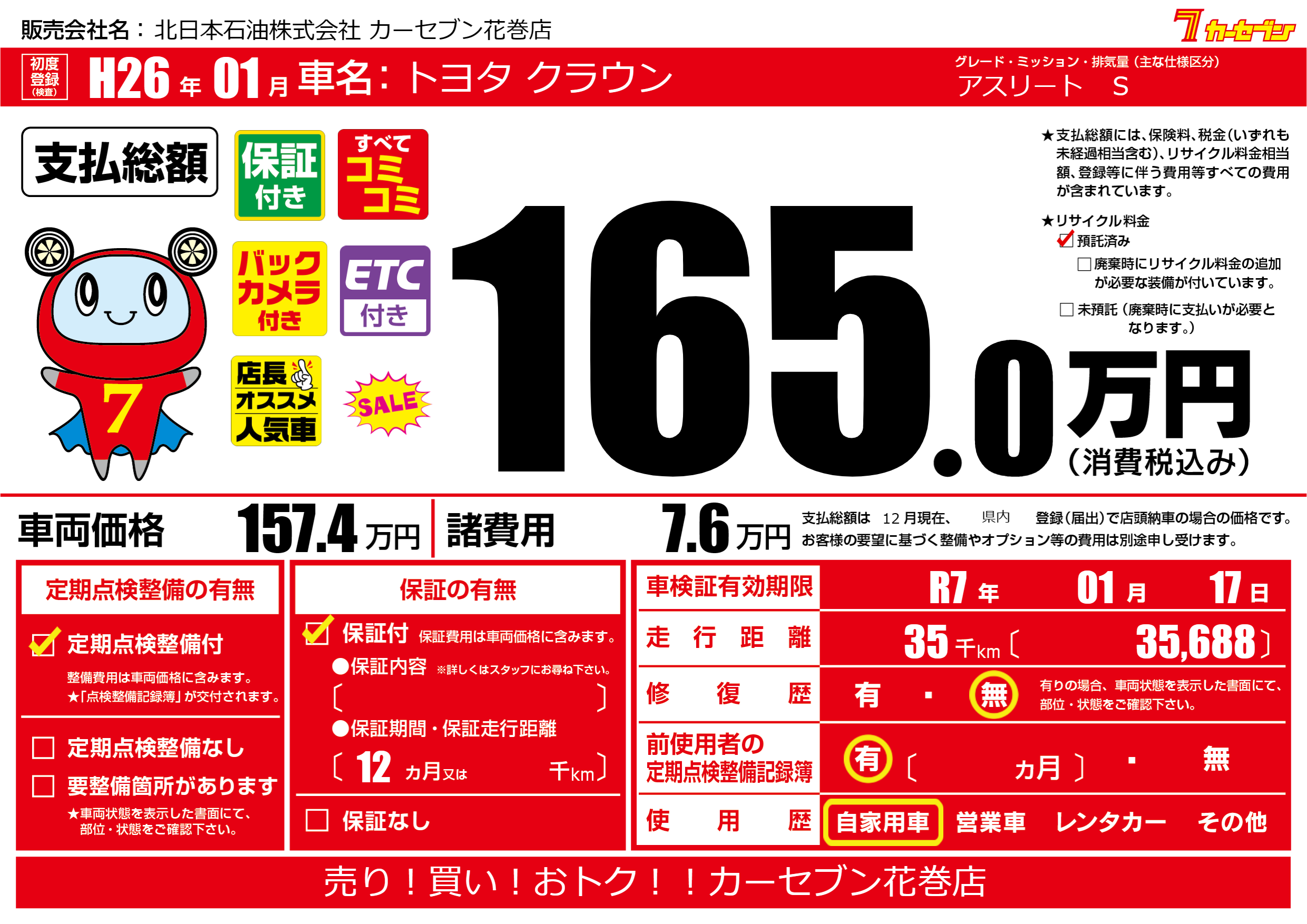 | 走行キロ | 3.5万km | 初年度登録 | H26年01月 |