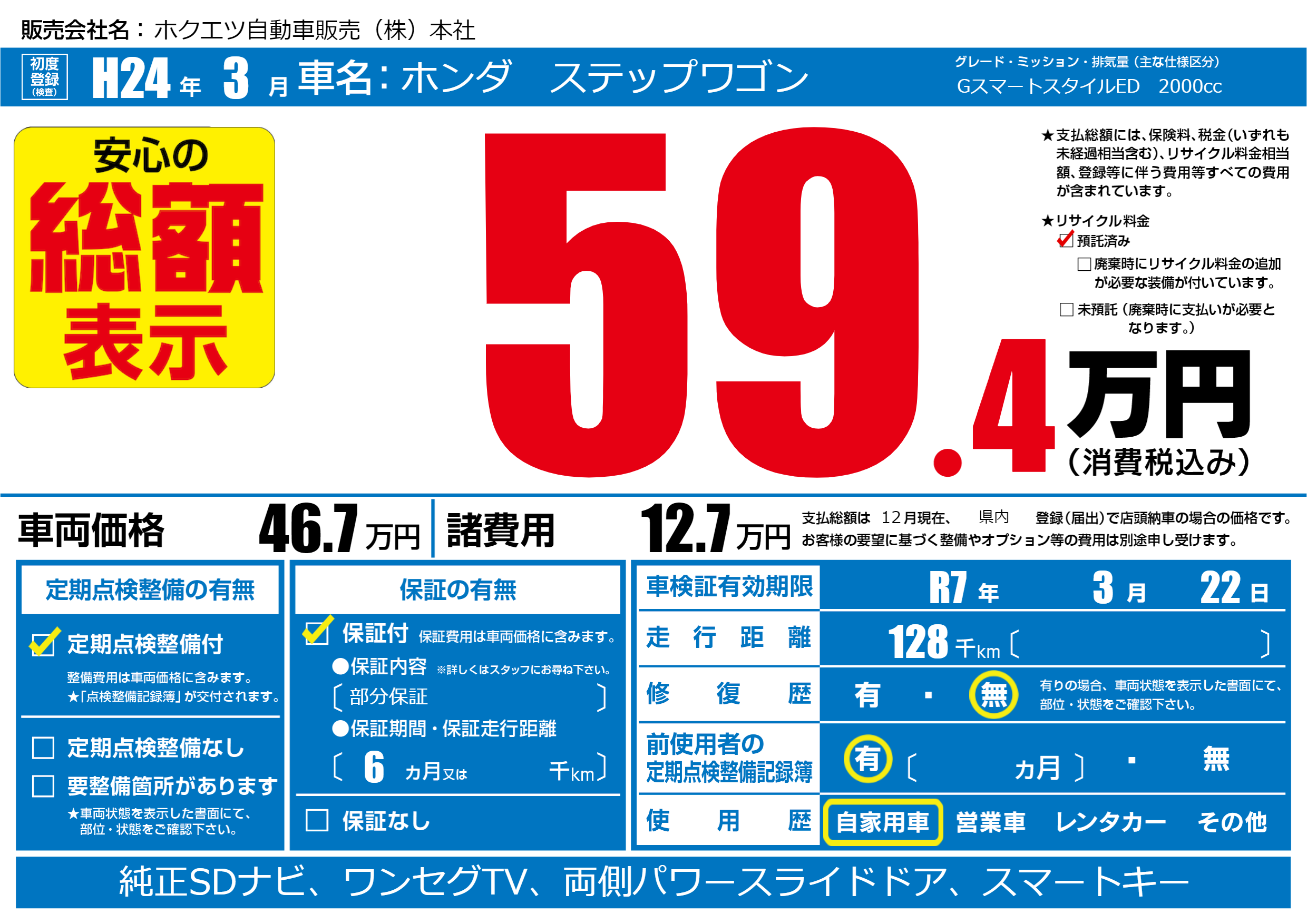 | 走行キロ | 12.8万km | 初年度登録 | H24年3月 |