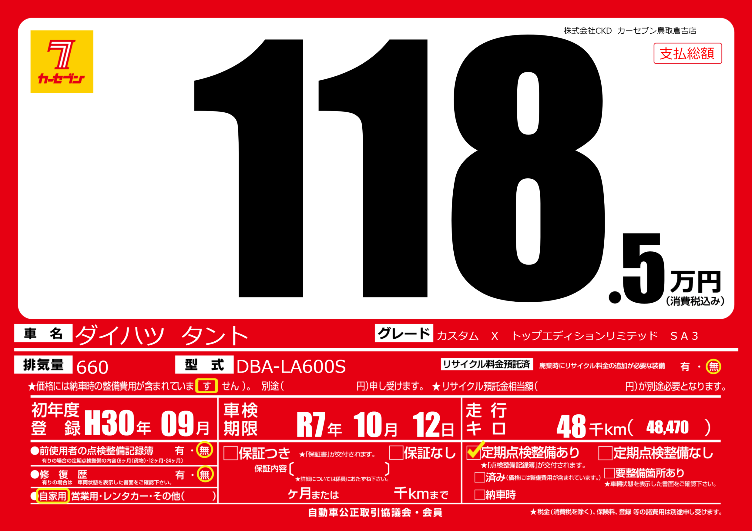 | 走行キロ | 4.8万km | 初年度登録 | H30年09月 |