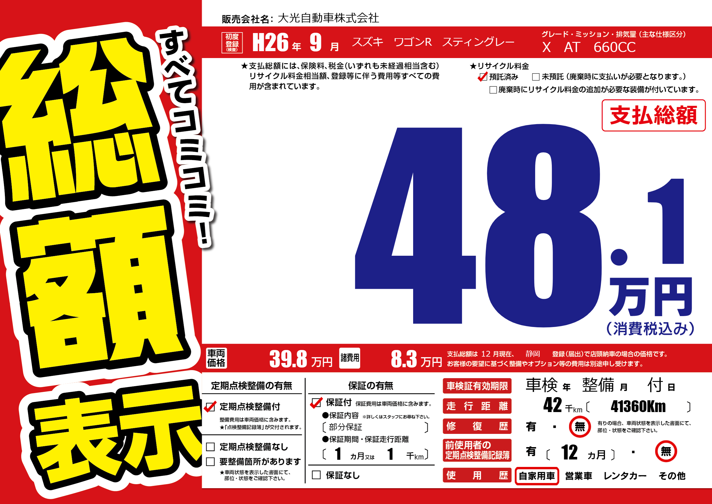 | 車名 | スズキ ワゴンR スティングレー | グレード ミッション 排気量 |