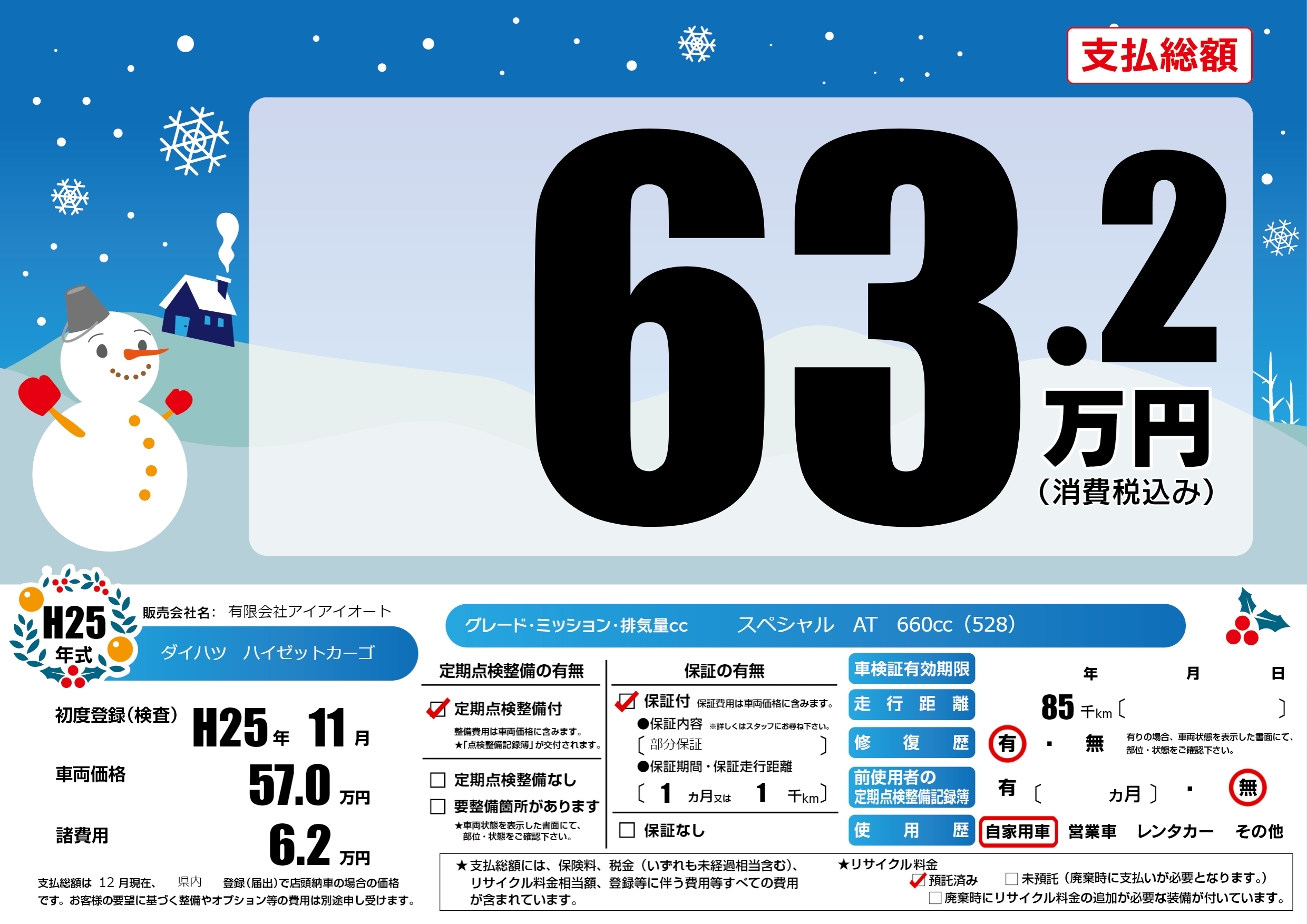 | 車名 | ダイハツ ハイゼットカーゴ | グレード ミッション 排気量 |