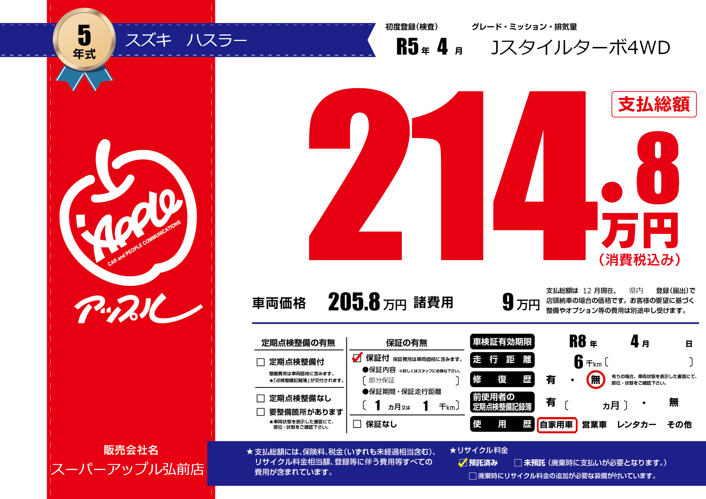| 車名 | スズキ ハスラー | グレード ミッション 排気量 |