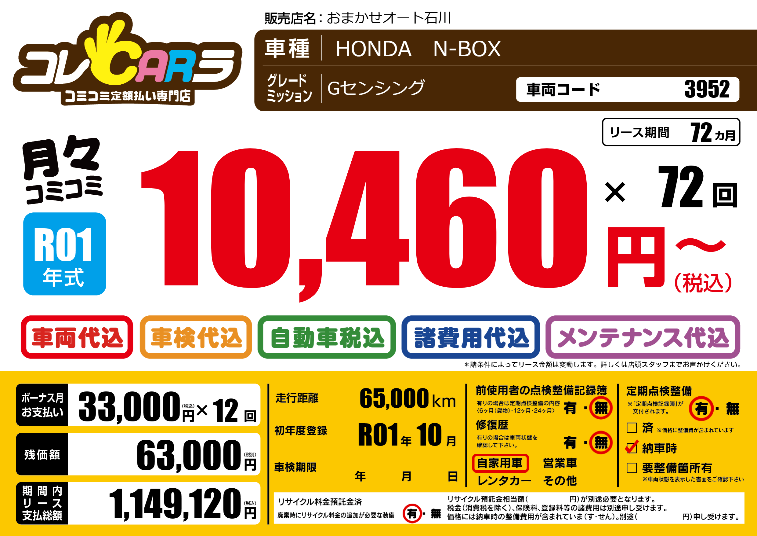 | 車名 | HONDA N-BOX | グレード ミッション 排気量 |