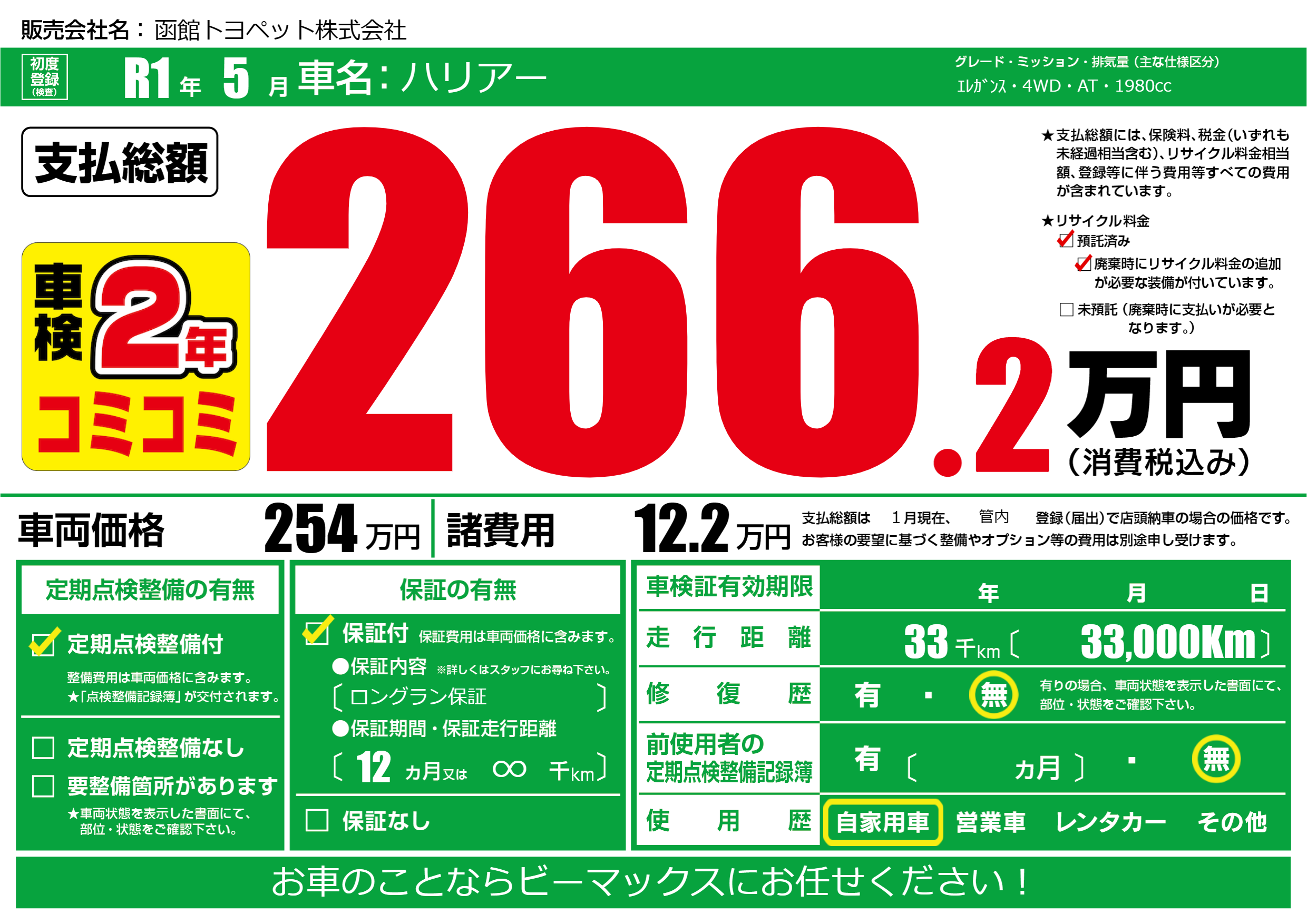 | 走行キロ | 3.3万km | 初年度登録 | R1年5月 |