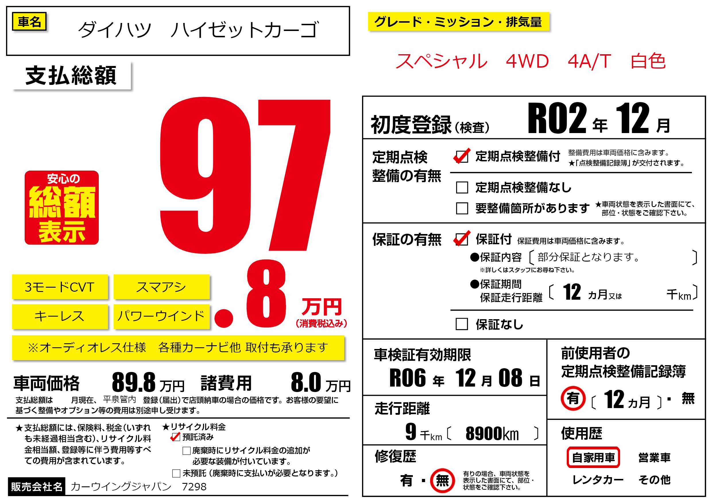 | 車名 | ダイハツ ハイゼットカーゴ | グレード ミッション 排気量 |