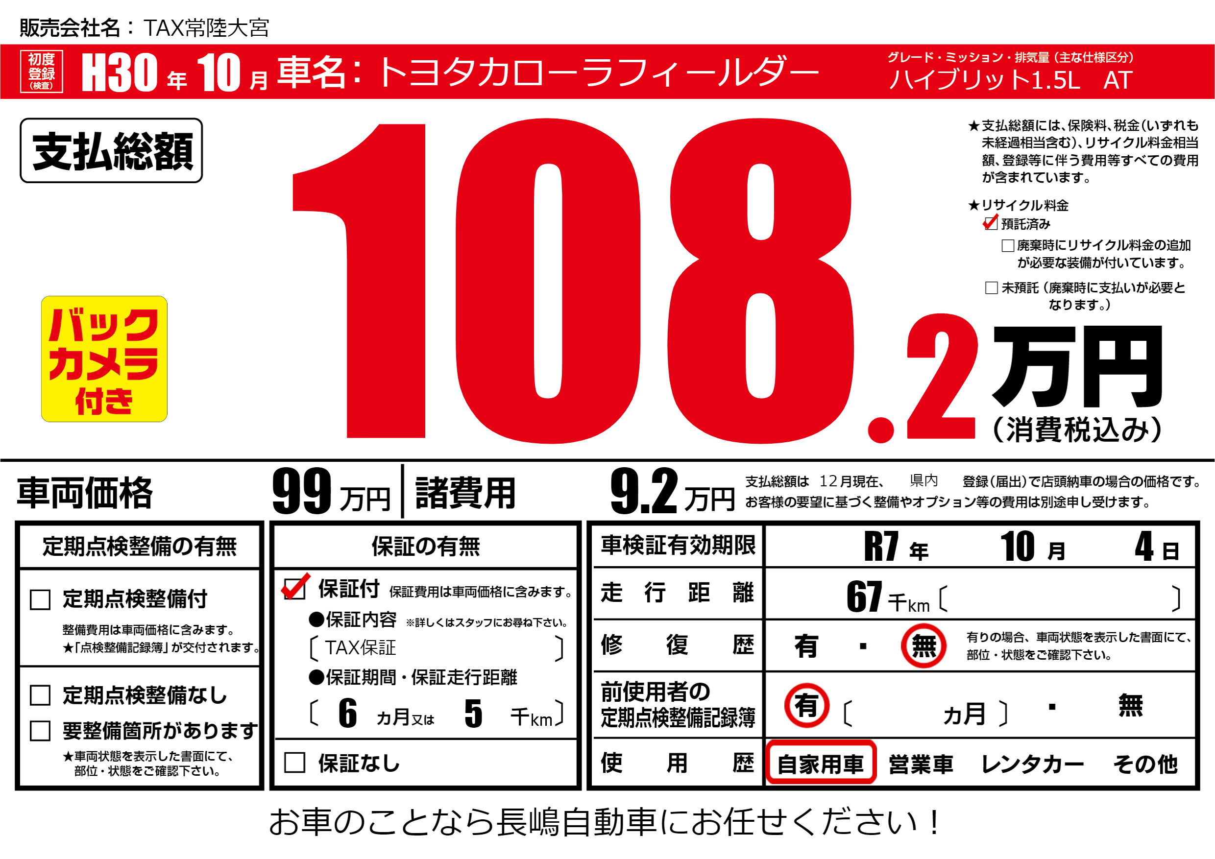 保証付き 保証内容(TAX保証) 6ヶ月または(5)千kmまで |