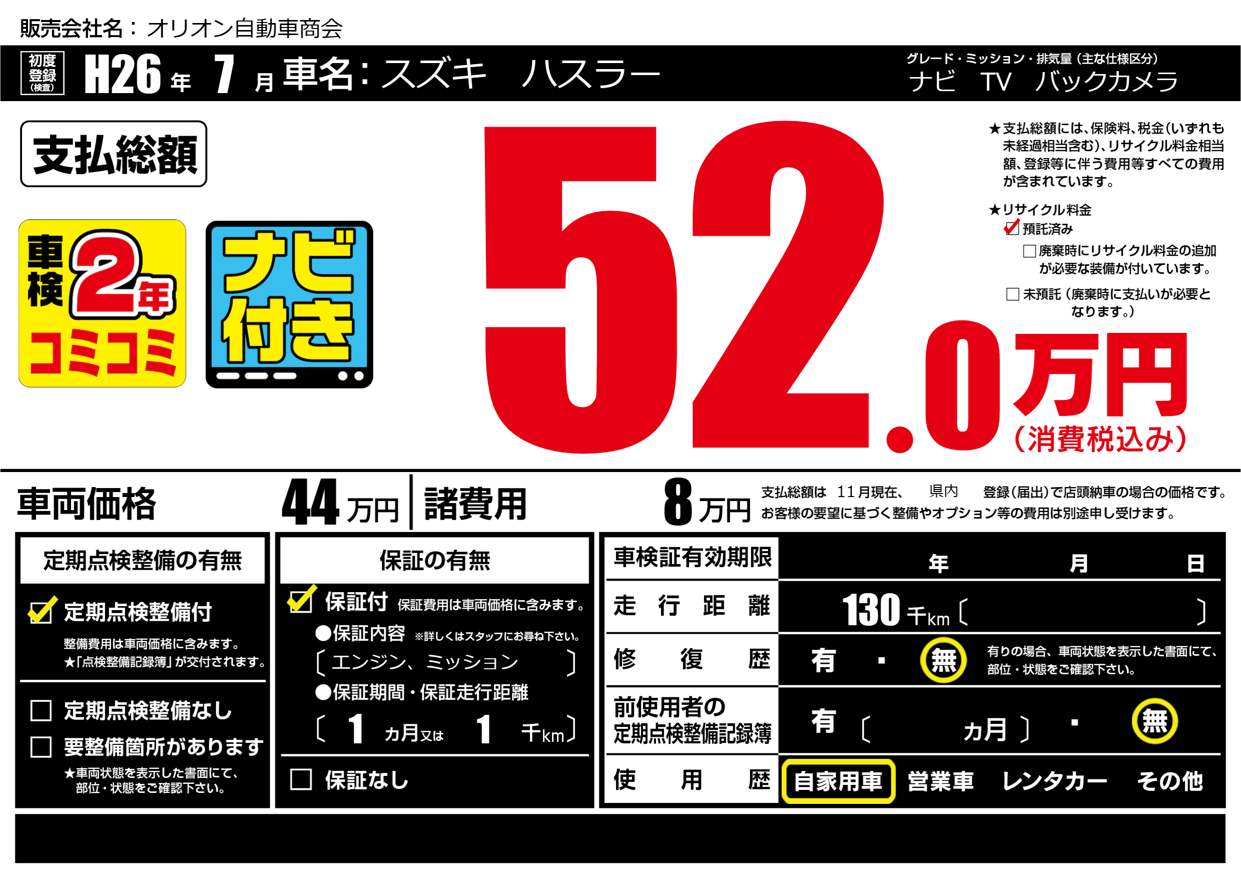| 走行キロ | 13万km | 初年度登録 | H26年7月 |