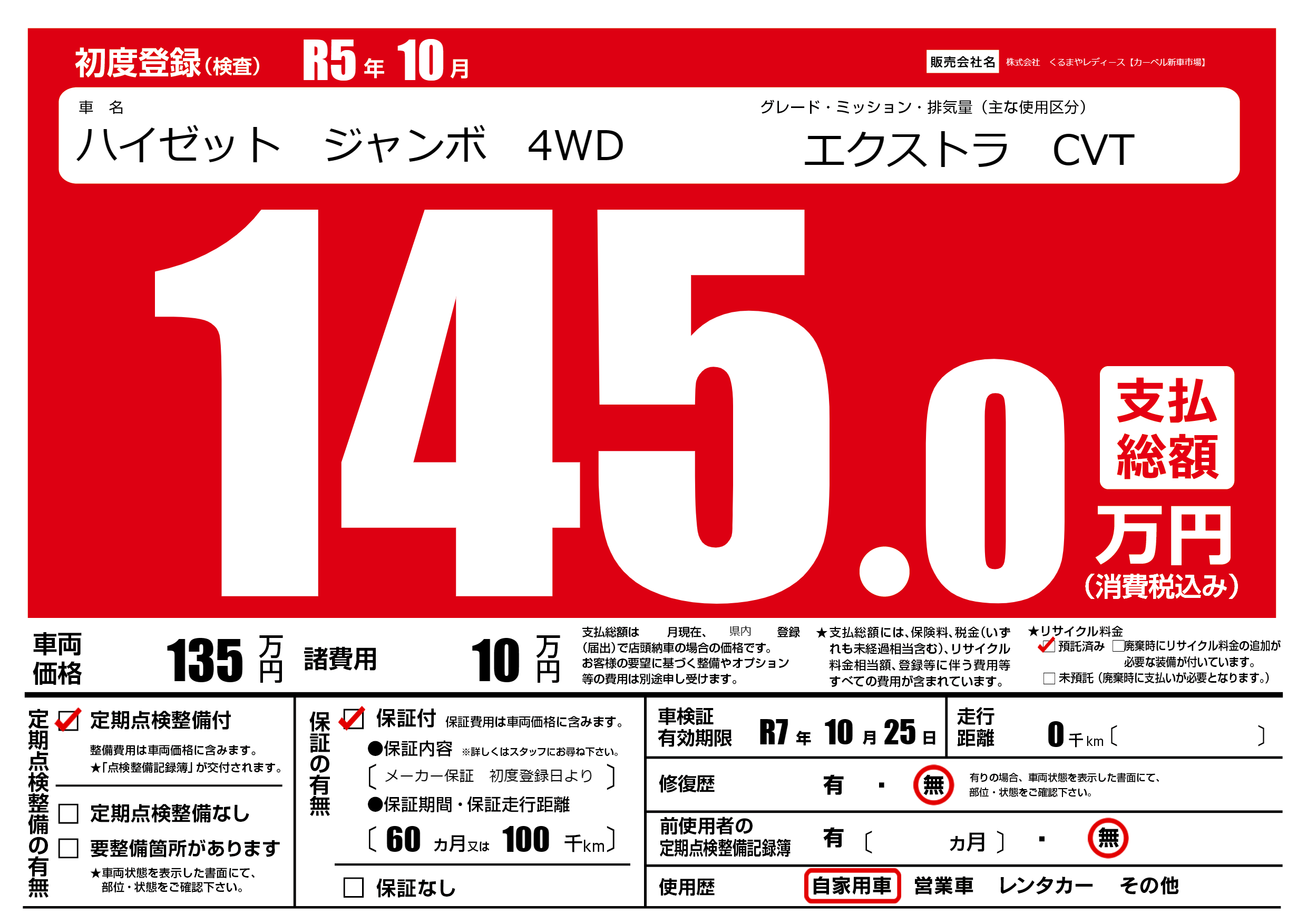 保証付き 保証内容(メーカー保証 初度登録日より) 60ヶ月または(100)千kmまで |