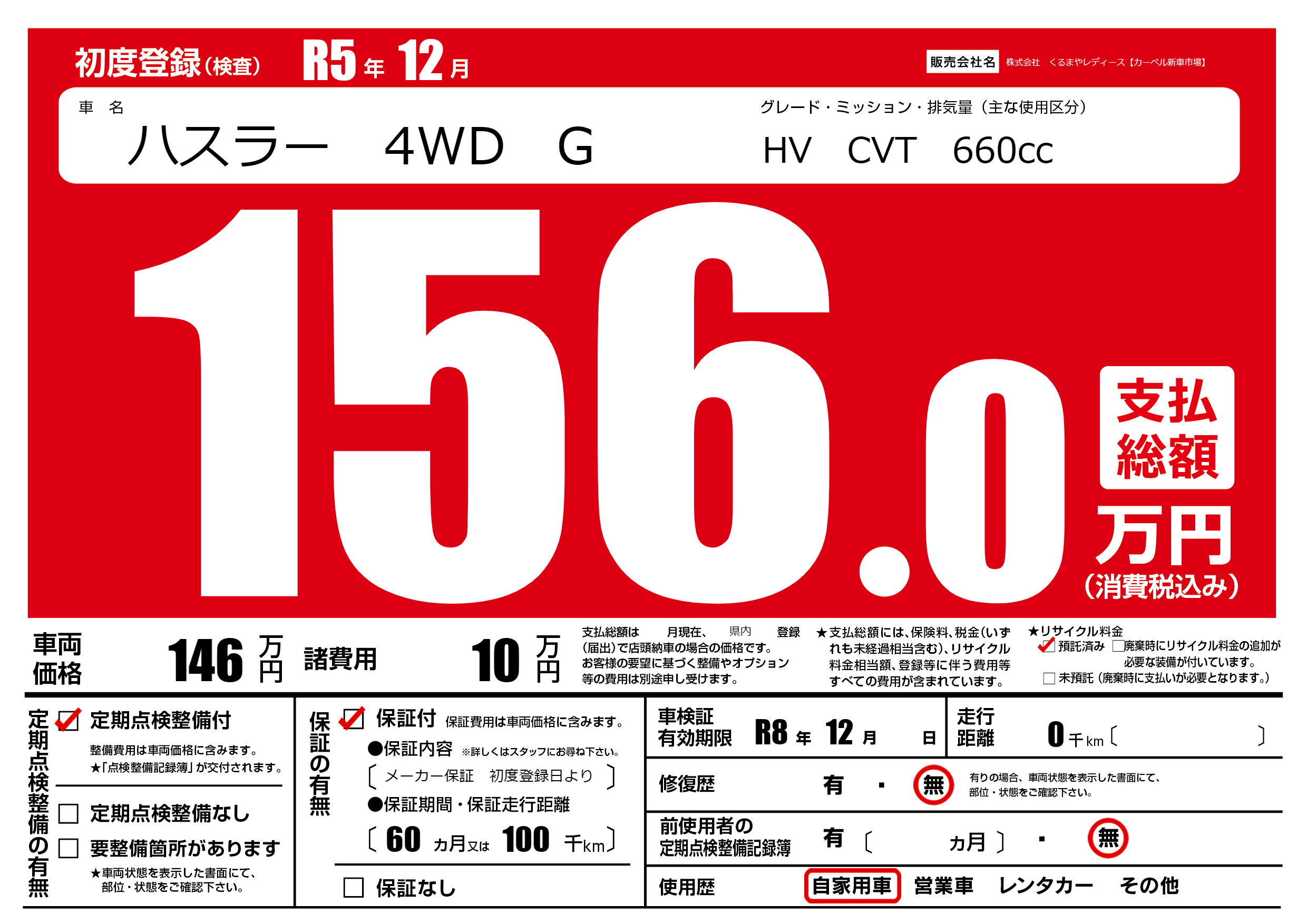 | 車名 | ハスラー 4WD G | グレード ミッション 排気量 |