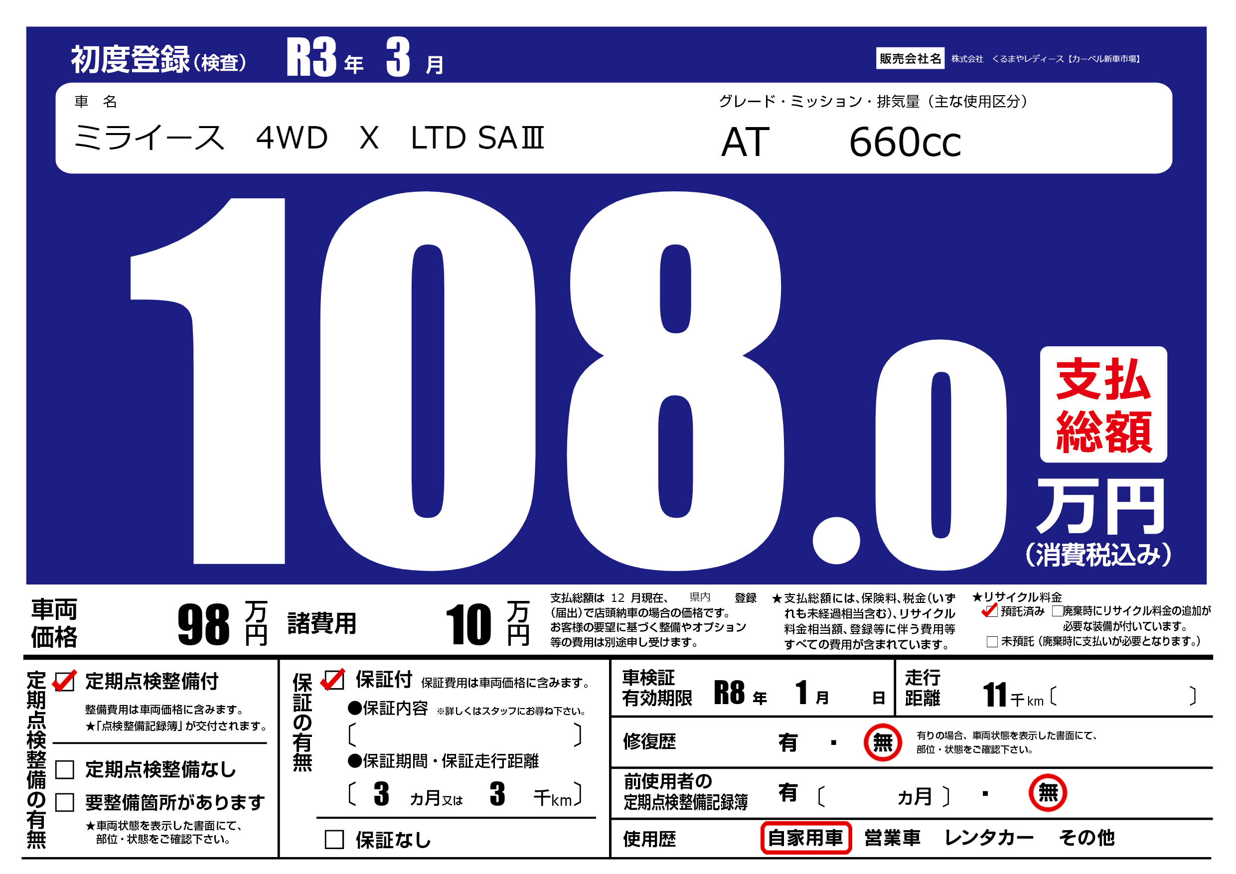 | 走行キロ | 1.1万km | 初年度登録 | R3年3月 |
