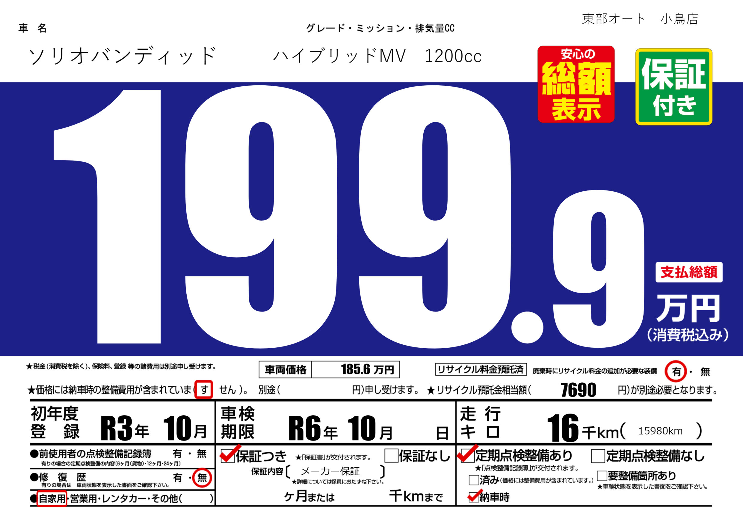 | 車検制限 | R6年 10月 - 日 | ||