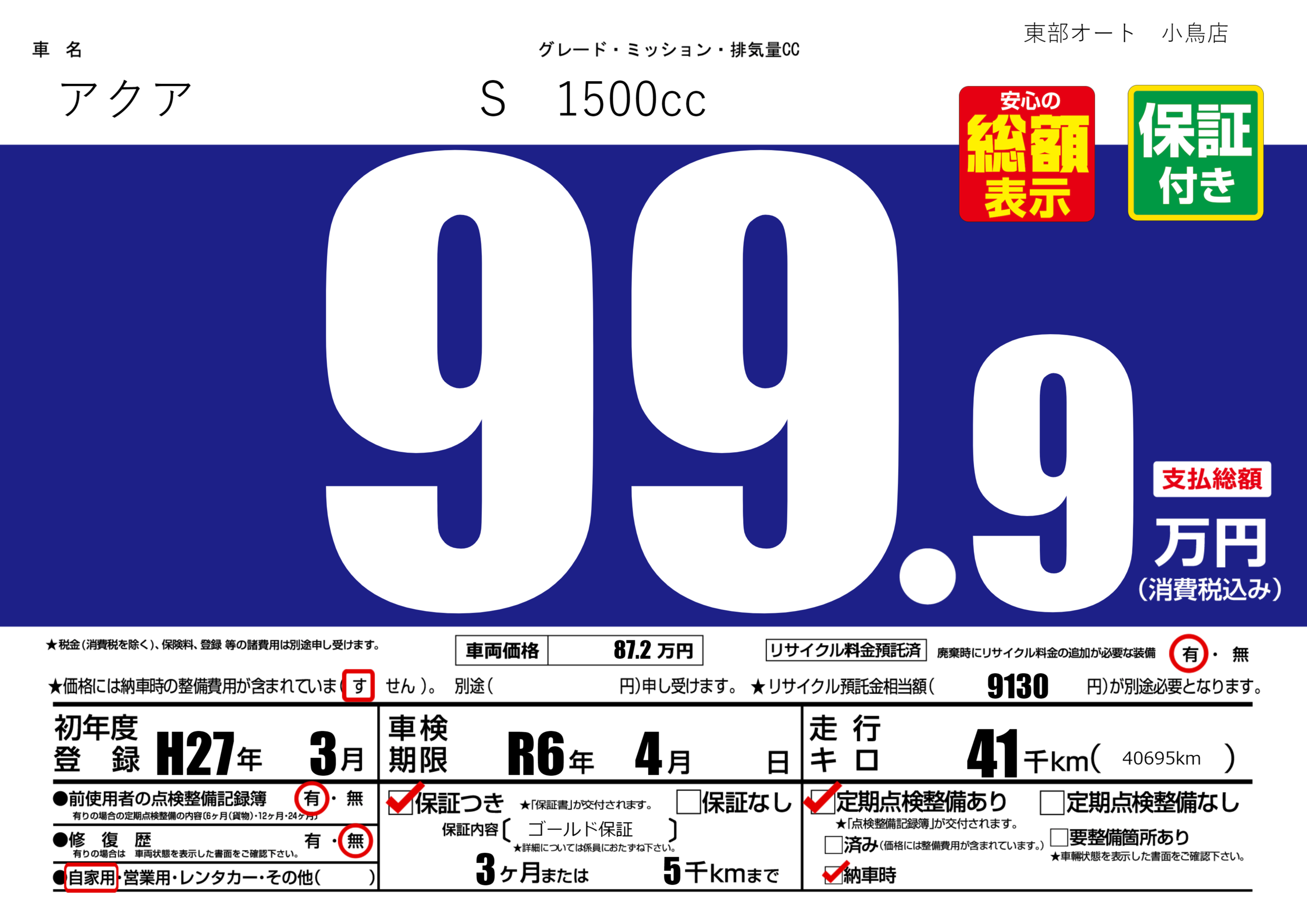 保証付き 保証内容( ゴールド保証 ) 3ヶ月または(5)千kmまで |