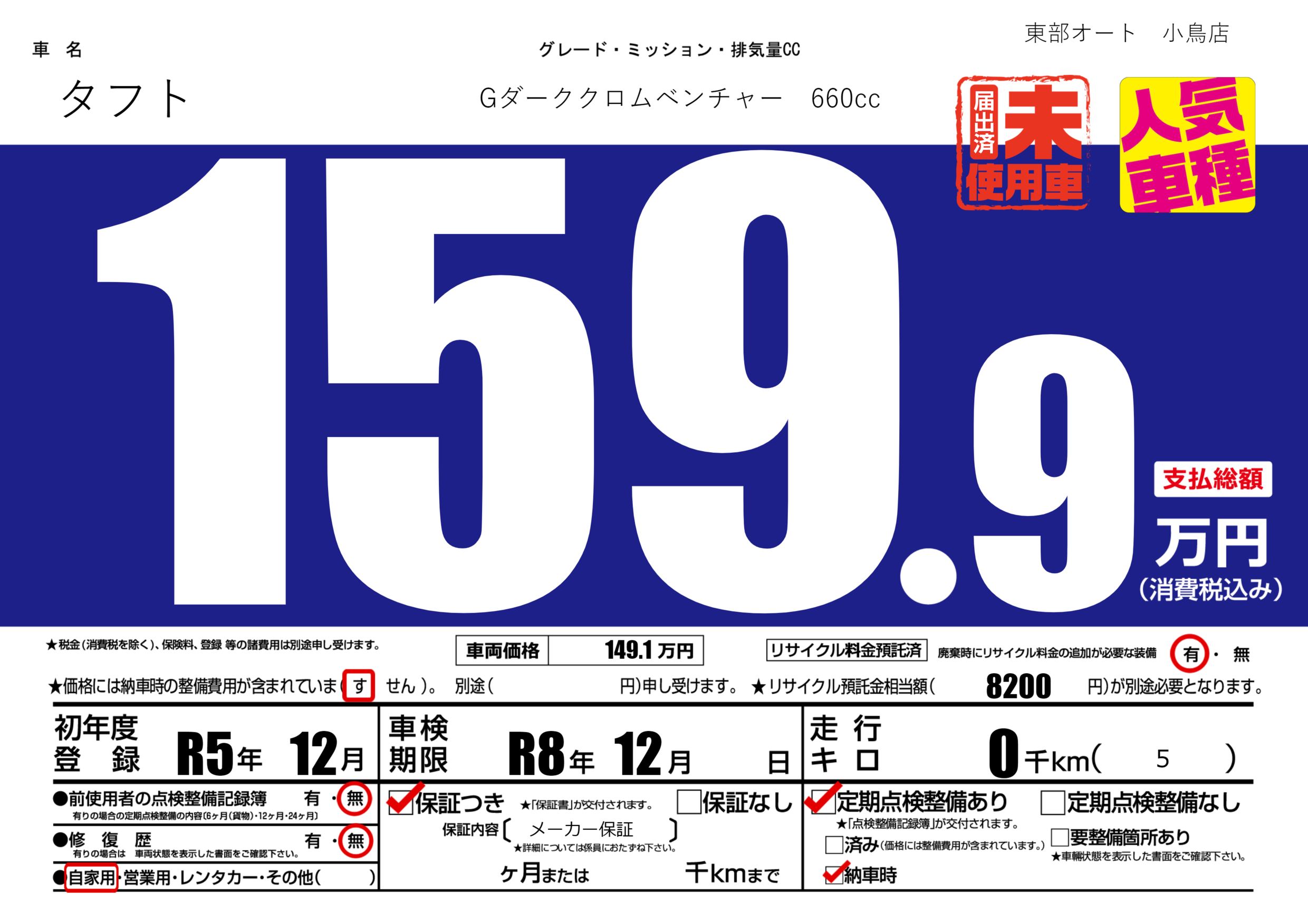 | 車検制限 | R8年 12月 - 日 | ||