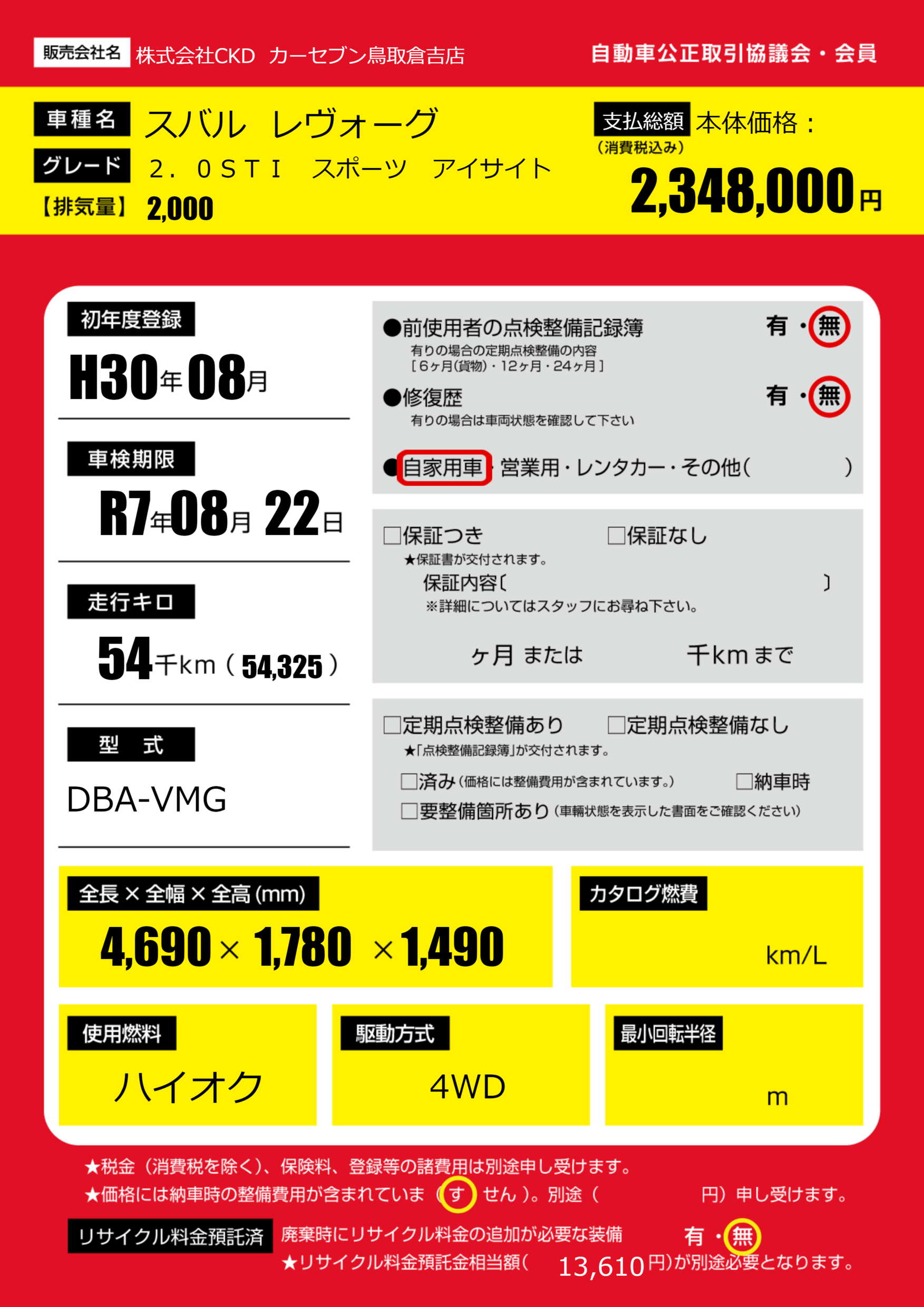 | 車名 | スバル レヴォーグ | グレード ミッション 排気量 |