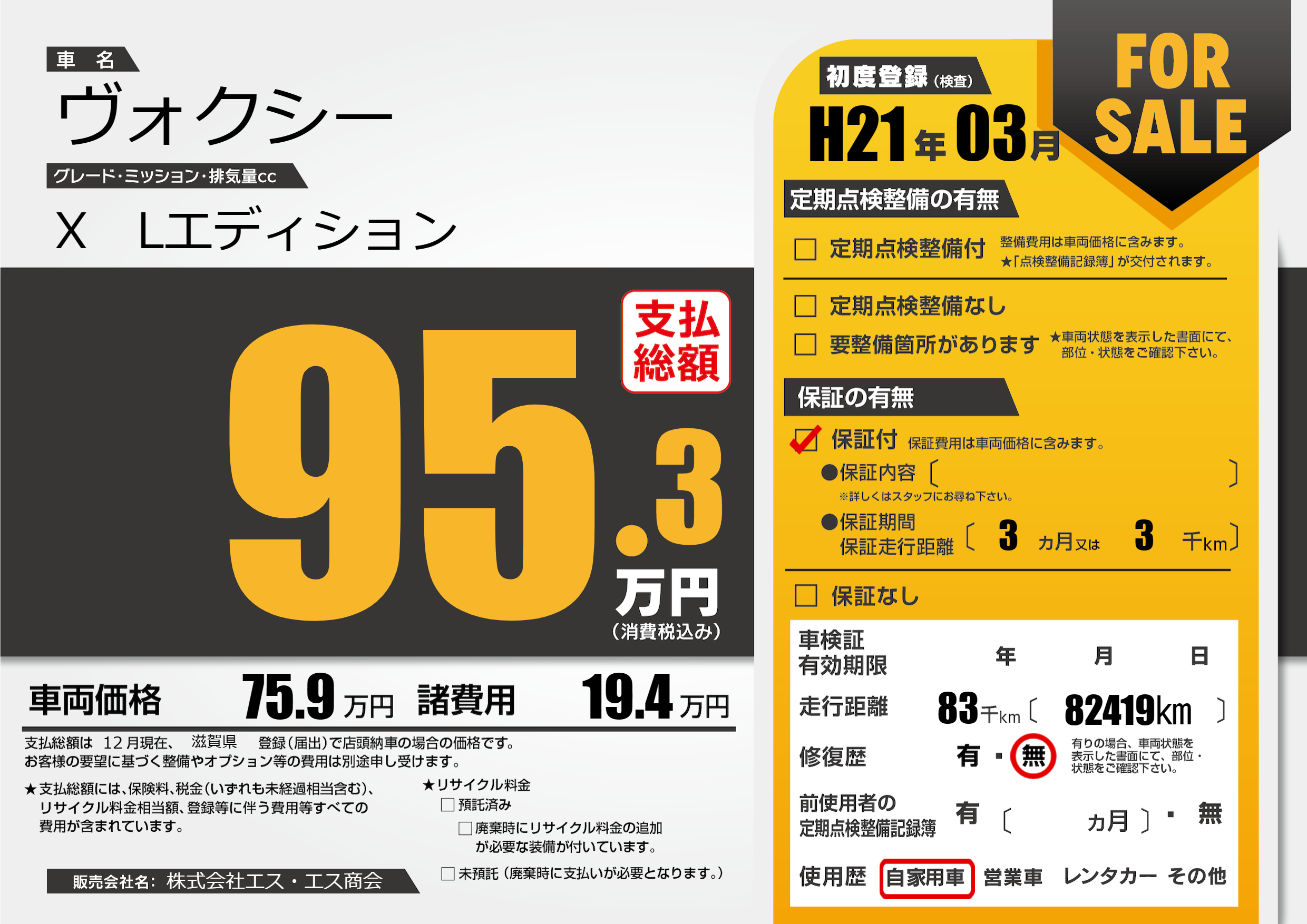 | 車名 | ヴォクシー | グレード ミッション 排気量 |