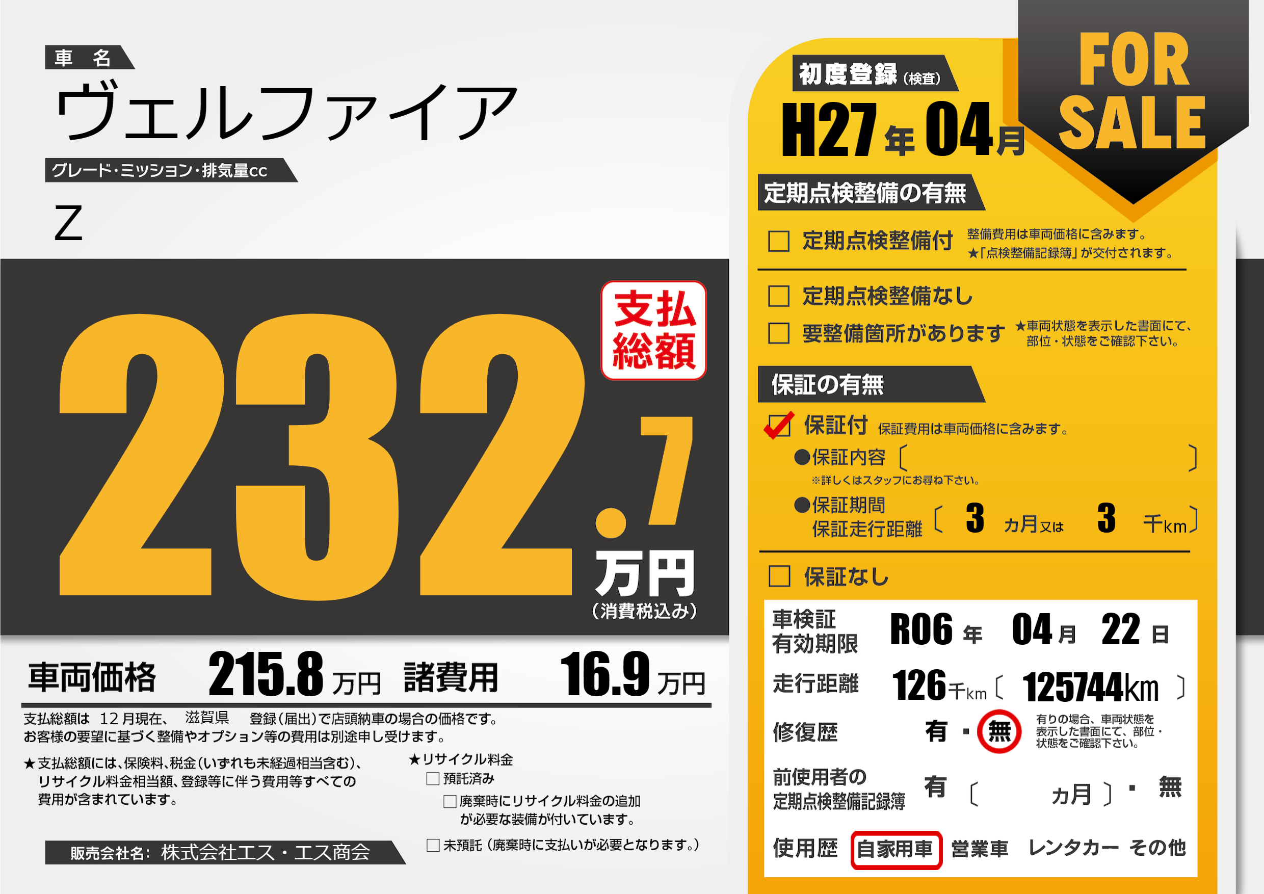 | 車名 | ヴェルファイア | グレード ミッション 排気量 |
